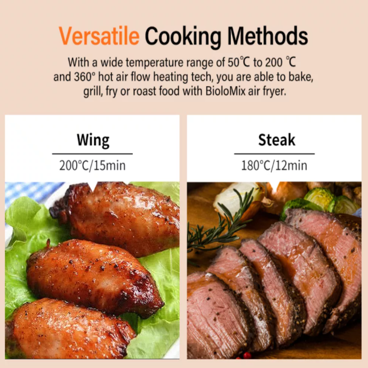 - Nồi chiên không khí Tất cả trong 1: Bạn có đang gặp rắc rối vì quá nhiều thứ bừa bộn trong nhà bếp? Đã đến lúc nói lời tạm biệt với nồi chiên nhúng nước, lò nướng bánh pizza, lò nướng bánh mì … Bất cứ điều gì họ có thể làm, lò nướng nồi chiên không khí BioloMix có thể làm tốt hơn! Thiết kế hai lớp độc đáo, tiết kiệm không gian và cho phép bạn chế biến nhiều loại thực phẩm cùng một lúc.