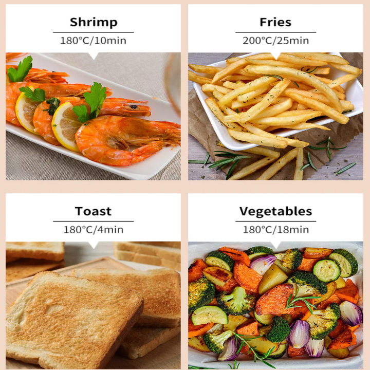- Không Dầu, Không Lo lắng: Vì sức khỏe của bạn và gia đình, tại sao bạn không tạm biệt cách chiên ngập dầu truyền thống? Lò nướng airfryer của chúng tôi nấu nướng bằng không khí nóng luân chuyển 360 °, có thể cung cấp cho bạn món ăn giòn mà ít hoặc không cần dầu, để người yêu của bạn ăn ngon miệng hơn! Thông số kỹ thuật sản phẩm