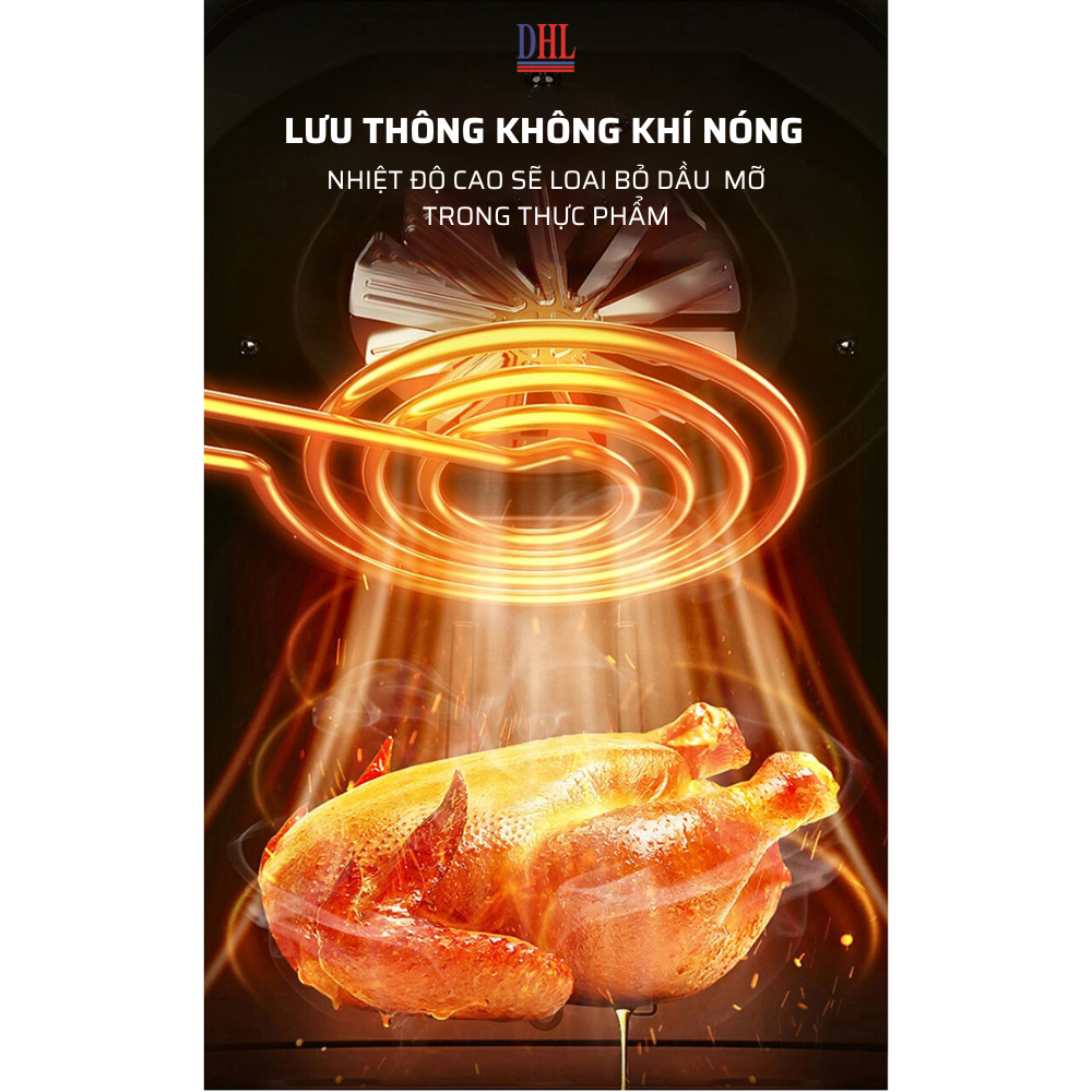 - Ứng dụng nguyên lý nguồn nhiệt đối lưu tuần hoàn 3 chiều, khí nóng lưu thông 360 độ giúp thực phẩm chín đều, không cần trở đi trở lại nhiều lần làm mất đi hương vị tươi ngon của thực phẩm.
