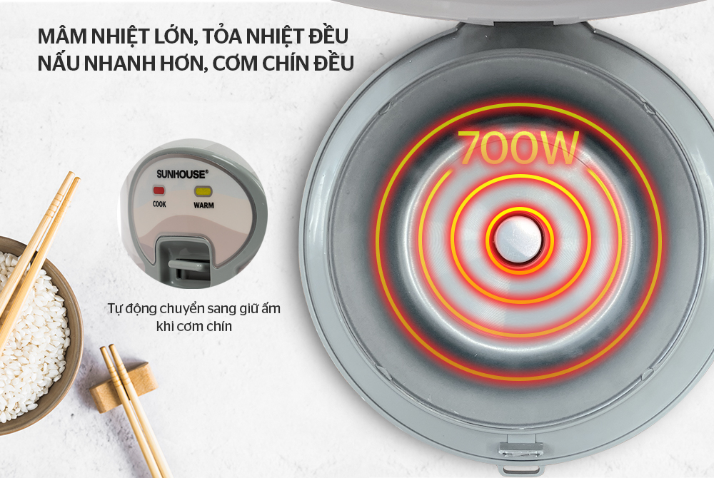 Công suất 700W sẽ giúp cho nồi cơm nấu cơm nhanh và chín đều, tiết kiệm được thời gian cũng như điện năng dành cho việc nấu cơm. Ngoài ra với dung tích nồi khoảng 1.8L, sản phẩm giúp bạn nấu ra được bữa cơm đủ cho gia đình từ 4 – 5 người, không phải tốn thời gian nấu lại nhiều lần.