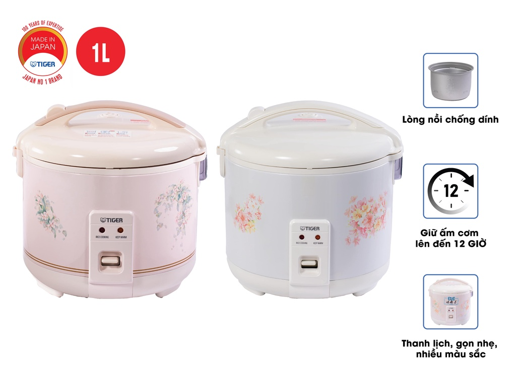 Nồi cơm điện Tiger JNP-1000 có kích thước nhỏ gọn và thiết kế với tông màu hồng trang nhã, trẻ trung, họa tiết tinh tế, giúp tô điểm thêm cho căn bếp của bạn.