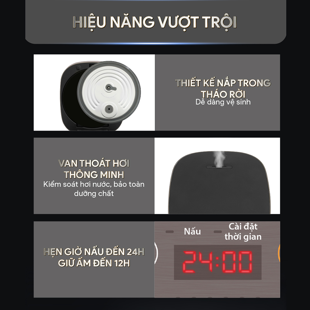 Đặc điểm sản phẩm Đáy nồi công nghệ mới: cơm ngon như nấu củi Dung tích 4 lít: phù hợp gia đình 2-8 người Hẹn giờ 12 tiếng: dễ lên lịch trình Vừa nấu vừa hấp: 1 nồi 2