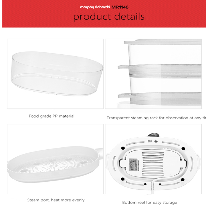 - Nồi hấp thực phẩm 3 tầng Morphy Richards MR1148 có thiết kế thời trang và tiện dụng, được tích hợp nhiều chức năng, cho bạn hấp được các loại thức ăn khác nhau mà không mất nhiều thời gian và công sức nấu nướng.