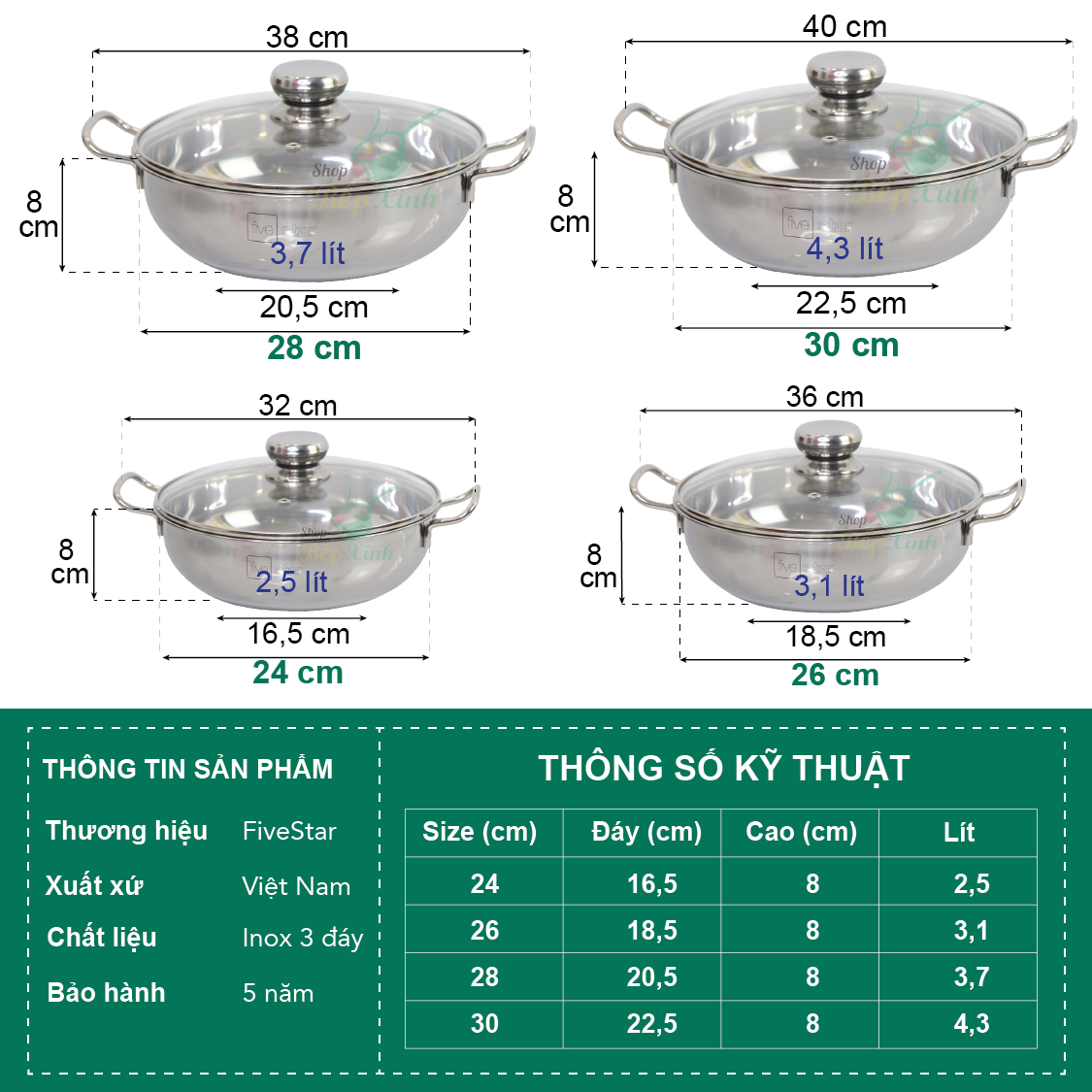 ✨Nồi lẩu 3 đáy inox 430 Fivestar sử dụng bếp từ nắp kính tặng 2 vá canh ( 24cm / 26cm / 28cm )