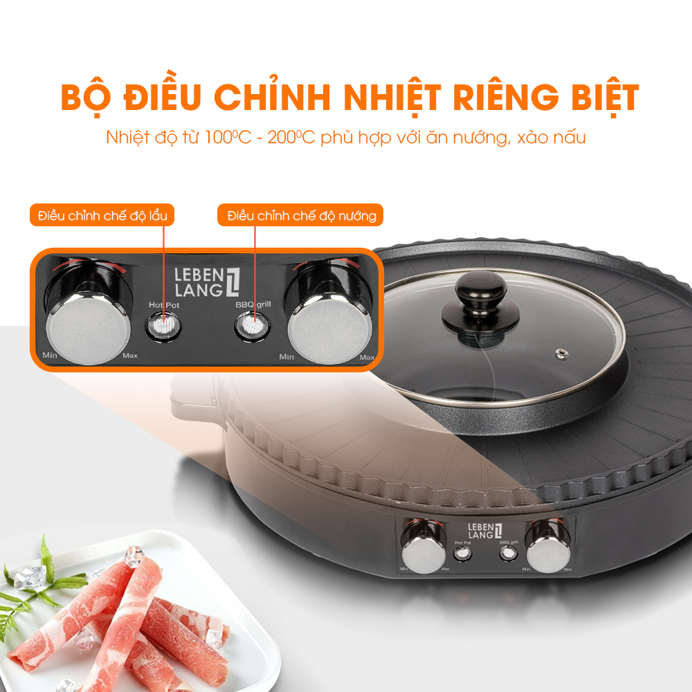 Nồi lẩu điện 2 ngăn Lebenlang LBTT5288, bếp lẩu nướng 2in1 đa năng tròn loại to,công suất 1800W tiện lợi cho gia đình   8 LÝ DO NÊN CHỌN NỒI LẨU NƯỚNG 2IN1 LEBENLANG LBTT5288 - Thiết kế 2 trong 1, 2 ngăn lẩu, 1 ngăn nướng, sử dụng đa năng, vừa có thể nấu lẩu, vừa có thể để nướng. - Bề mặt nồi được phủ chống dính cao cấp, hạn chế tối đa tình trạng đồ ăn bám dính trên bề mặt bếp, đồng thời an toàn cho sức khỏe người sử dụng. - Công suất 1800W, hoạt động mạnh mẽ, giúp nấu chín đồ ăn dễ dàng. - Sở hữu 2 bộ điều chỉnh nhiệt riêng biệt theo từng chế độ lẩu – nướng khác nhau, linh hoạt khi sử dụng. - Kích thước lớn, dễ dàng nấu lẩu và nướng cho đại gia đình từ 4-6 người. - Thân nồi được làm từ chất liệu hợp kim nhôm, bền bỉ vượt thời gian giúp sử dụng lâu dài. - Có khay hứng dầu, dễ dàng tháo rời, tiện lợi khi sử dụng và vệ sinh. - Tay cầm cách nhiệt, an toàn khi cầm, nắm và nhấc, đặt nồi sang vị trí khác.   I. THÔNG SỐ KỸ THUẬT - Thương hiệu: Lebenlang - Model: LBTT5288 - Công suất: 1800W - Điện áp: 220-240V - Kích thước bếp lẩu nướng: 40cm - Kích thước nồi lẩu: 20,5cm - Dung tích nồi lẩu: 1L5 - Trọng lượng: 2,6 KG       II. Đặc điểm nổi bật - Nồi lẩu nướng 2IN1 Lebenlang LBTT5288 được thiết kế thông minh với 2 ngăn lẩu riêng biệt kết hợp với mặt nướng xung quanh nồi lẩu. Nhờ vậy, người dùng có thể sử dụng đa năng, vừa có thể nấu lẩu, vừa có thể để nướng, tiện lợi khi sử dụng.   - Với phương châm “trải nghiệm của khách hàng là yếu tố hàng đầu”, Lebenlang thiết kế bề mặt nồi lẩu nướng được phủ chống dính cao cấp, hạn chế tối đa tình trạng đồ ăn bám dính trên bề mặt bếp, đồng thời an toàn cho sức khỏe người sử dụng.   - Nồi có công suất 1800W, hoạt động mạnh mẽ, giúp nấu chín đồ ăn dễ dàng. Bạn có thể nướng chín đồ ăn nhanh chóng, đồng thời nước lẩu sôi nhanh, giúp bạn và gia đình không mất thời gian chờ đợi.   - Nồi lẩu nướng 2IN1 Lebenlang LBTT5288 sở hữu 2 bộ điều chỉnh nhiệt riêng biệt theo từng chế độ lẩu – nướng khác nhau. Bạn có thể điều chỉnh nhiệt độ riêng để nấu lẩu, đồng thời bạn cũng có thể điều chỉnh nhiệt riêng để nướng đồ ăn.   - Kích thước bếp lẩu nướng Lebenlang lớn với đường kính lên đến 40cm, giúp người dùng có thể thả lẩu và nướng nhiều đồ ăn cùng lúc. Nồi có thể sử dụng cho đại gia đình từ 4-6 người.
