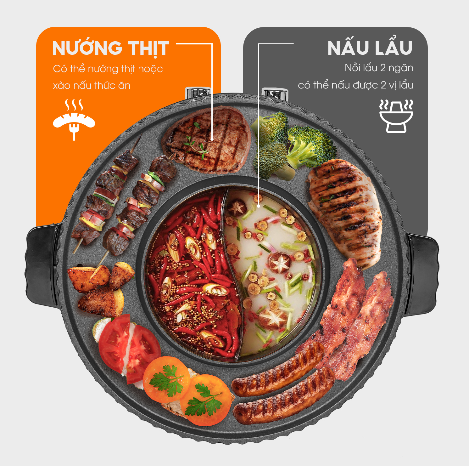 Là một thiết bị nhà bếp sử dụng điện năng để chuyển hóa thành nhiệt năng nhằm mục đích phục vụ 2 nhu cầu cùng lúc đó là: * Nấu lẩu * Làm đồ nướng