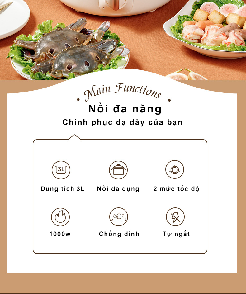 Đặc điểm nổi bật Nồi lẩu điện đa năng: Lẩu, chiên, xào, rán, hấp, luộc Dung tích lớn 5.0 lít, phù hợp cho nhu cầu 4 - 6 người. Thiết kế tiện dụng, tháo lắp dễ