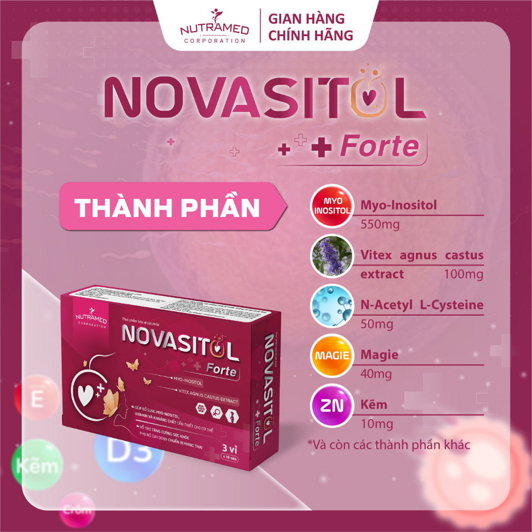 THÀNH PHẦN ️ Myo-Inositol, Vitex agnus castus extract (chiết xuất cây Trinh nữ châu Âu), N-Acetyl L-Cysteine, Magie (Magie oxide), Kẽm (Kẽm sulfat monohydrate), Folic acid (Calci-L-methyl-folate), Crôm (Crom picolinate), Selenium (Natri selenite), Vitamin D3 (Cholecalciferol), Vitamin E (DL-alpha-tocopherol).   CÔNG DỤNG   ️ Giúp bổ sung Myo-inositol, vitamin và khoáng chất cần thiết cho cơ thể, hỗ trợ tăng cường sức khỏe phụ nữ giai đoạn chuẩn bị mang thai.   ĐỐI TƯỢNG SỬ DỤNG ️ Phụ nữ dự định có thai.   HƯỚNG DẪN SỬ DỤNG ️ Ngày uống 2 viên, sáng uống 1 viên, chiều uống 1 viên, uống sau khi ăn.   KHÔNG SỬ DỤNG TRONG TRƯỜNG HỢP ️ Người mẫn cảm với bất kỳ thành phần nào của sản phẩm.   LƯU Ý ️ Không uống sản phẩm cùng nước có gas, cafein, trà. Trong thời gian sử dụng sản phẩm không được sử dụng rư,ợu bi,a, thu,ốc l,á. Có thể có rối loạn dạ dày ruột nhẹ khi mới bắt đầu dùng Novasitol forte. Tuy nhiên các rối loạn nhẹ này sẽ tự hết trong 3-4 ngày.  ️ Thực phẩm này không phải là thuốc, không có tác dụng thay thế thuốc chữa bệnh. BẢO QUẢN ️ Nơi khô ráo, nhiệt độ dưới 30°C, tránh ánh sáng mặt trời. Để xa tầm tay trẻ em. THÔNG TIN SẢN PHẨM Sản phẩm: NOVASITOL Forte Quy cách đóng gói: Hộp 3 vỉ x 10 viên. Hạn sử dụng: 36 tháng kể từ ngày sản xuất. Tiêu chuẩn: TCCS   Nutramed - Khơi Nguồn Khoa Học Tới Cuộc Sống Nhà máy đạt chuẩn WHO – GMP, nguyên liệu kiểm tra chất lượng nghiêm ngặt, đảm bảo an toàn và hiệu quả.