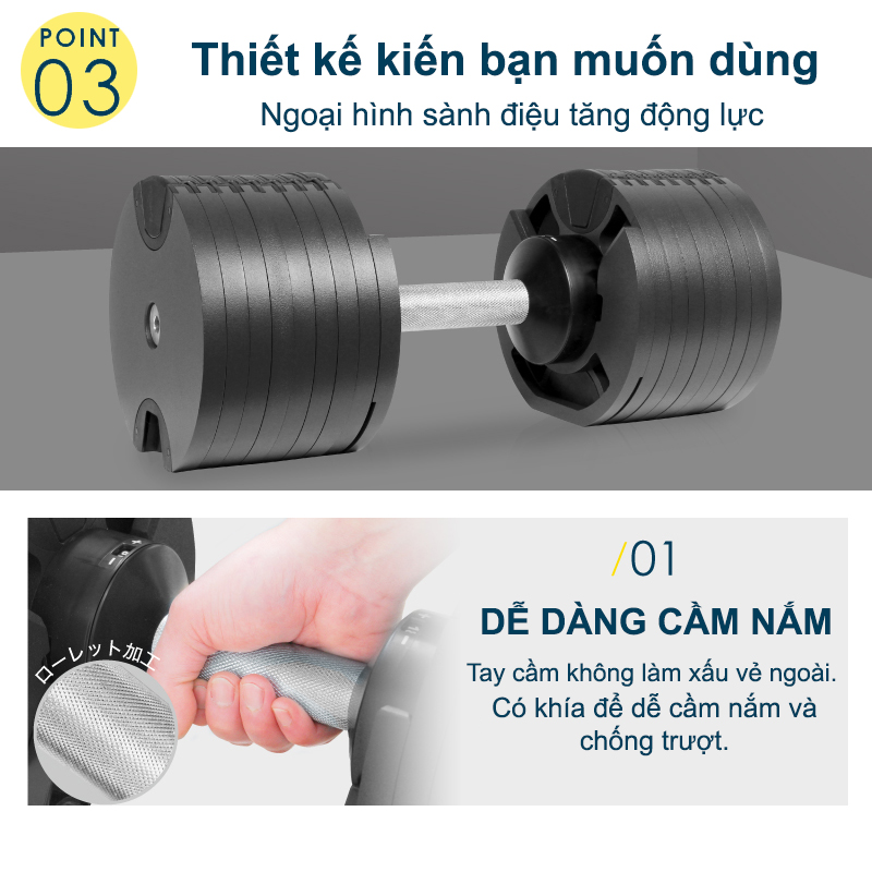 Mô Tả Sản Phẩm Bộ 2 Tạ Tay 48kg Điều Chỉnh Khóa Số Tự Động Cao Cấp mỗi bên 24kg (ảnh thực tế) Màu sắc : Toàn bộ sản phẩm được sơn đen