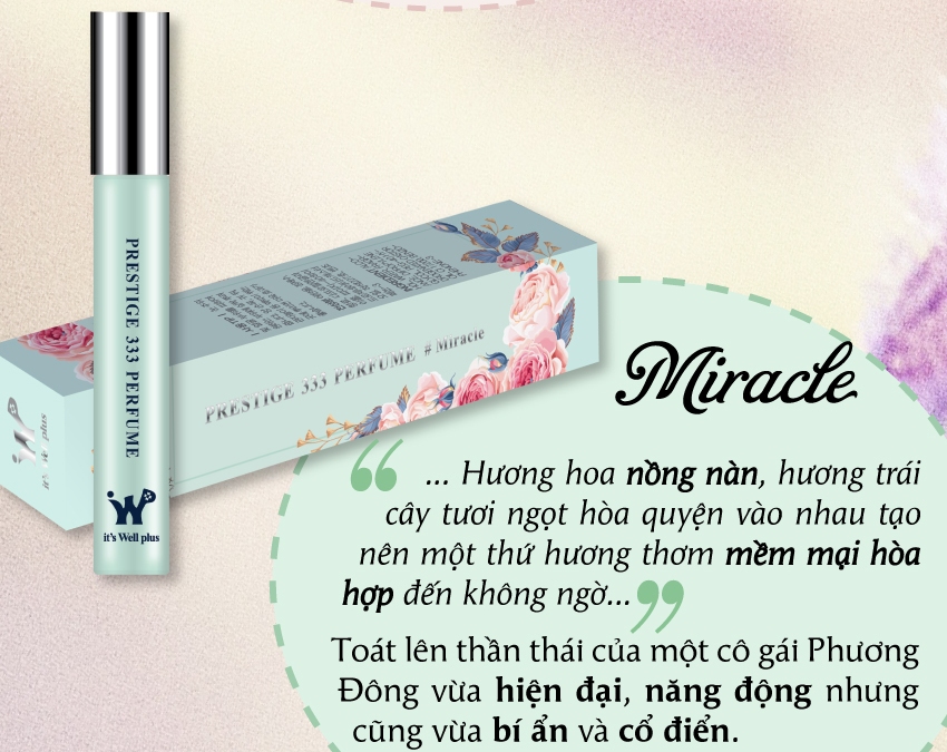 Nước Hoa It's Well Plus Prestige 333 Perfume Miracle PP-M (9ml) - Hương hoa nồng nàn, hương trái cây tươi ngọt hòa quyện vào nhau tạo nên một thứ hương thơm mềm mại hòa hợp đến không ngờ.