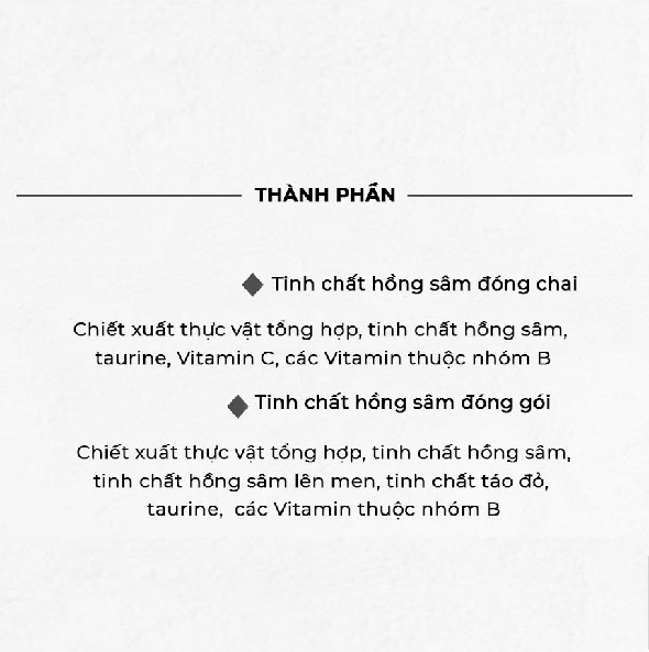 Mua tại Tiktok- Thành phần:Chiết xuất hồng sâm (hàm lượng chất rắn trên 15%, nước, hồng sâm Hàn Quốc 6 năm tuổi) 100%.