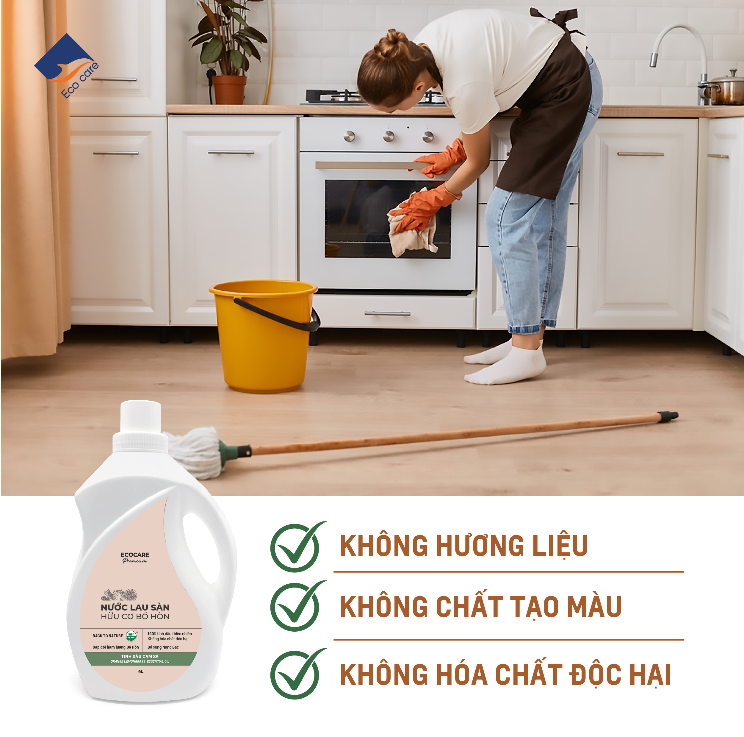 Nước lau sàn chứa hóa chất độc hại có thể bám lại trên sàn nhà, dễ dàng tiếp xúc với da và tỏa hương thơm hóa học khi lau. Nước lau sàn hữu cơ Fuwa3e