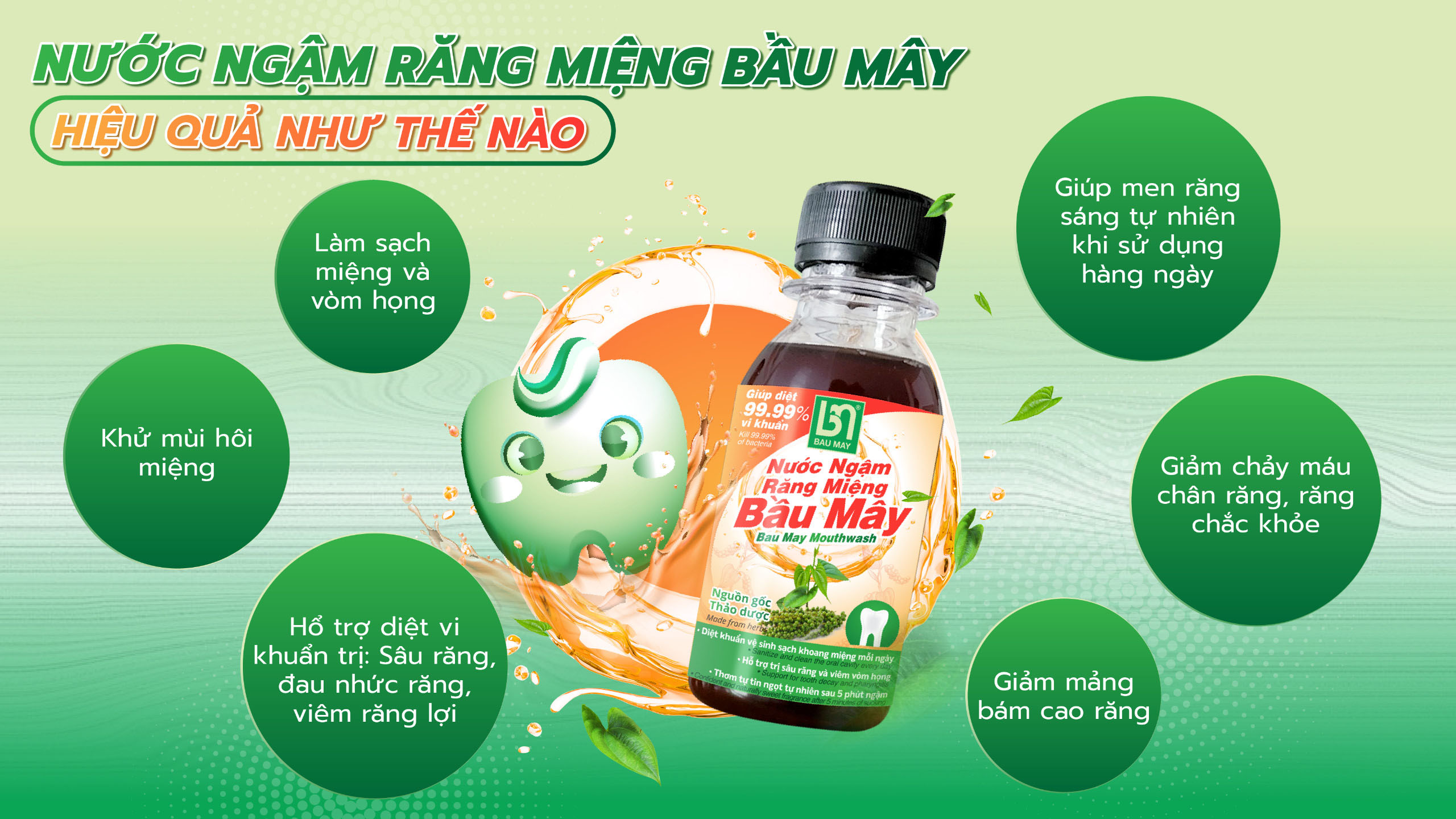 Công dụng của Nước ngậm răng miệng Bầu Mây bao gồm làm sạch răng miệng, khử mùi hôi, giảm mảng bám và giúp kháng khuẩn. Sản phẩm cũng hỗ trợ giảm viêm, sâu răng, đau nhức răng, giảm mảng bám cao răng, viêm nướu (lợi), viêm quanh răng, nhiệt miệng và chảy máu chân răng. Đồng thời, Nước ngậm răng miệng Bầu Mây cũng làm dịu khoang miệng, giảm chứng sưng đỏ, viêm lợi và chảy máu chân răng.