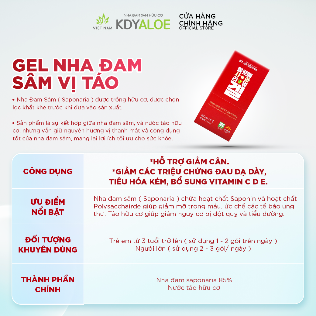 Nước nha đam sâm táo hữu cơ KDY ALOE* Thương hiệu: KDY ALOE* Xuất xứ: Hàn Quốc* Quy cách: 30gói/hộp* Dung tích: 100ml/ gói* Dạng: gel* Thành phần chính: Nha đam Saponaria hữu cơ (Hàn Quốc) 85%,...