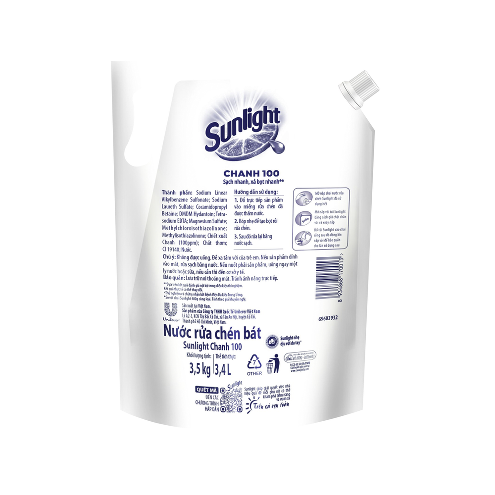 VÌ SAO BẠN SẼ THÍCH? Nước rửa chén Sunlight Chanh, nay với công nghệ xả bọt nhanh mang lại khả năng đánh bay dầu mỡ hiệu quả hơn, không bám bọt. Ưu điểm nổi bật: Sản phẩm có khả năng rửa sạch dầu mỡ cả trên đồ nhựa và dịu nhẹ dịu với da tay, an toàn cho người dùng. Với hương chanh tươi mát, đây sẽ là sự lựa chọn hoàn hảo cho các bà nội trợ. Thành phần: Sodium Linear Alkylbenzene Sulfonate, Sodium Laureth Sulfate, Cocamidopropyl Betaine, DMDM Hydantoin, Tetrasodium EDTA, Methylchloroisothiazolinone, Methylisothiazolinone, Chiết xuất chanh (100ppm), Chất thơm, Cl 19140, Nước. Hướng dẫn sử dụng: Pha loãng sản phẩm vào nước hoặc sử dụng trực tiếp, rửa sạch các vết bẩn và tráng lại chén đĩa bằng nước sạch. Sản phẩm cùng thương hiệu: