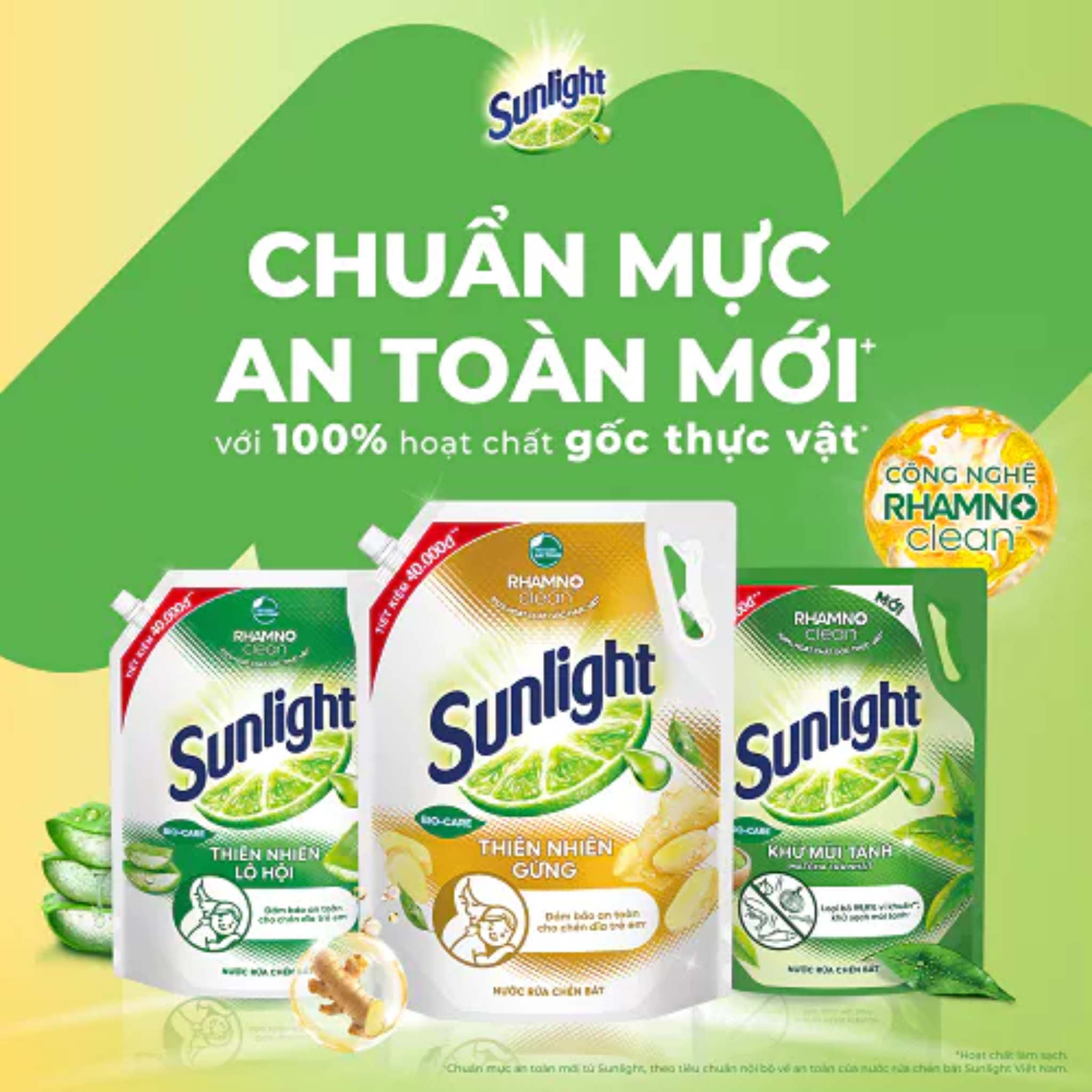 MÔ TẢ SẢN PHẨM Sunlight ra mắt Nước rửa chén bát Sunlight Bio-care Mới với công nghệ độc quyền Rhamno Clean chứa 100% hoạt chất làm sạch gốc thực vật. Với cải tiến trong công thức, Sunlight Bio-care Mới mang đến chuẩn mực an toàn mới, đảm bảo an toàn cho chén dĩa trẻ em và cũng rất thân thiện với môi trường. Sunlight cam kết 0% hóa chất độc hại đến gần gia đình bạn, đảm bảo an toàn & lành tính. Công thức độc quyền: Thành phần làm sạch từ đường thiên nhiên lên men nhờ vi sinh vật có lợi, 100% hoạt chất gốc thực vật. 0% thành phần làm sạch gốc dầu mỏ & 0% phẩm màu & 0% paraben 99.7% phân hủy sinh học Bao bì nhựa tái sinh (tính trên loại bao bì từ chai) 3 công nặng vượt trội: