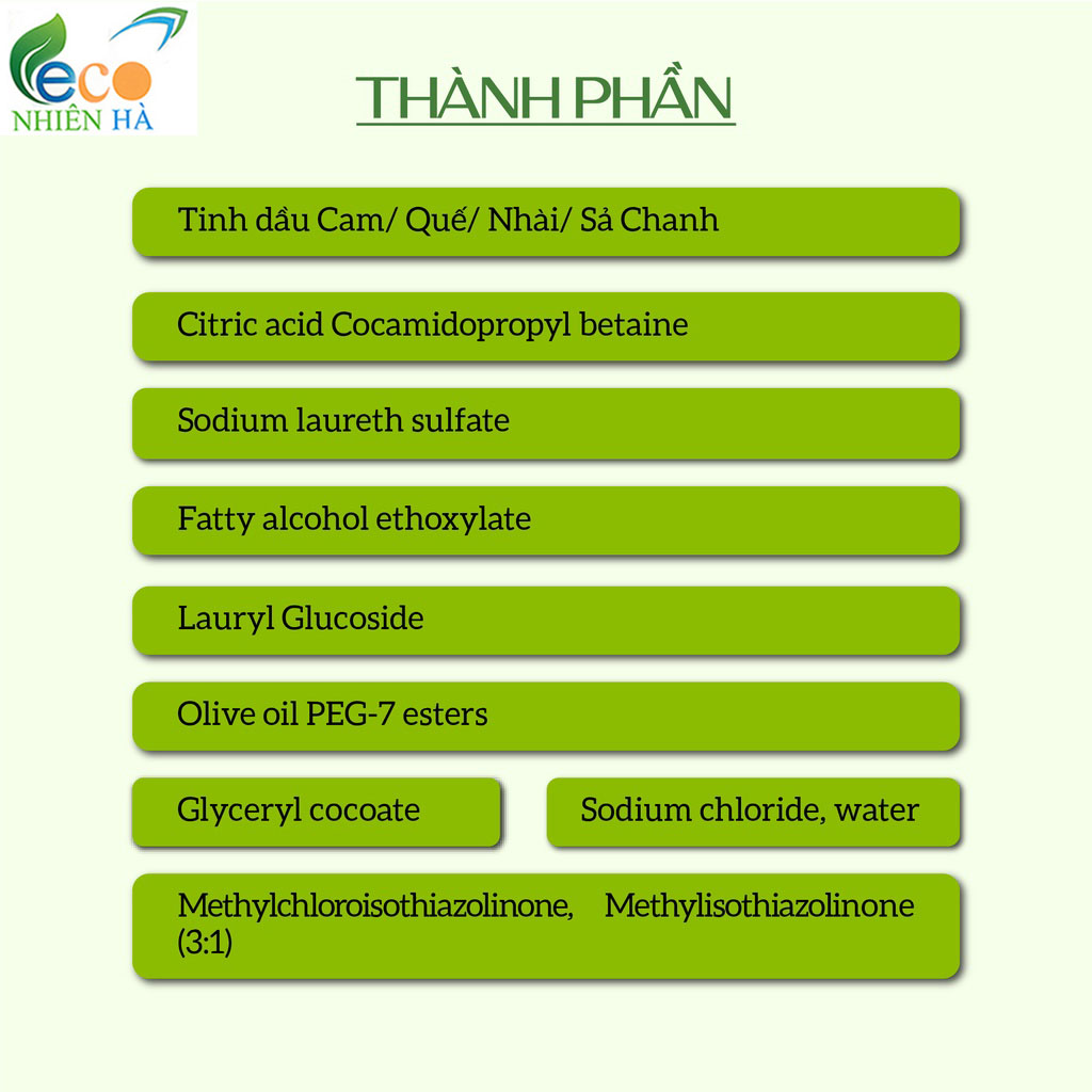 THÀNH PHẦN ► Sodium laureth sulfate nguồn gốc dầu cọ (làm sạch dầu mỡ) ► Soap-berry (Bồ hòn), tinh dầu thiên nhiên cam/quế/nhài 15ml , nước tinh khiết ► Cocamidopropyl Betaine, PEG- 7, Glyceryl cocoate &Potassium cocoate (Chiết xuất từ dầu dừa) ► Lauramine Oxide, Citric acid (Axit chanh), Macadamia oil (Dầu maccao), Glycine oil, Avocado oil ► Wheat bran extract (Chiết xuất lúa mỳ), Calendula extract & Chamomila extract (Chiết xuất hoa cúc), ..