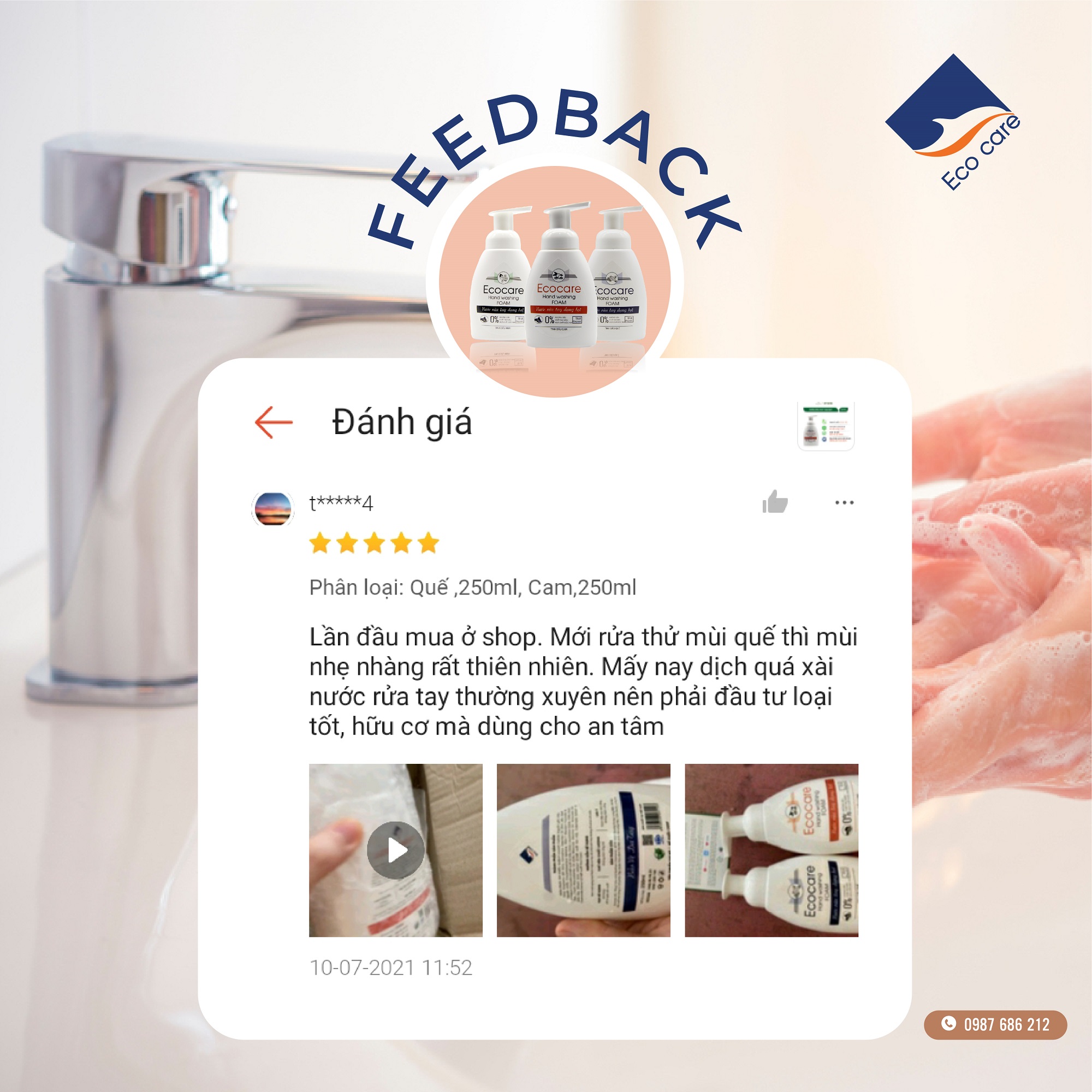 • Trước tiên, Công ty Ecocare xin cảm ơn Quý Khách hàng đã tin tưởng lựa chọn sản phẩmNước rửa tay tạo bọt Hữu cơ 250ml, Nước rửa tay xà phòng diệt khuẩn tinh dầu thiên nhiên (Cam/Quế/Nhài) của Ecocare