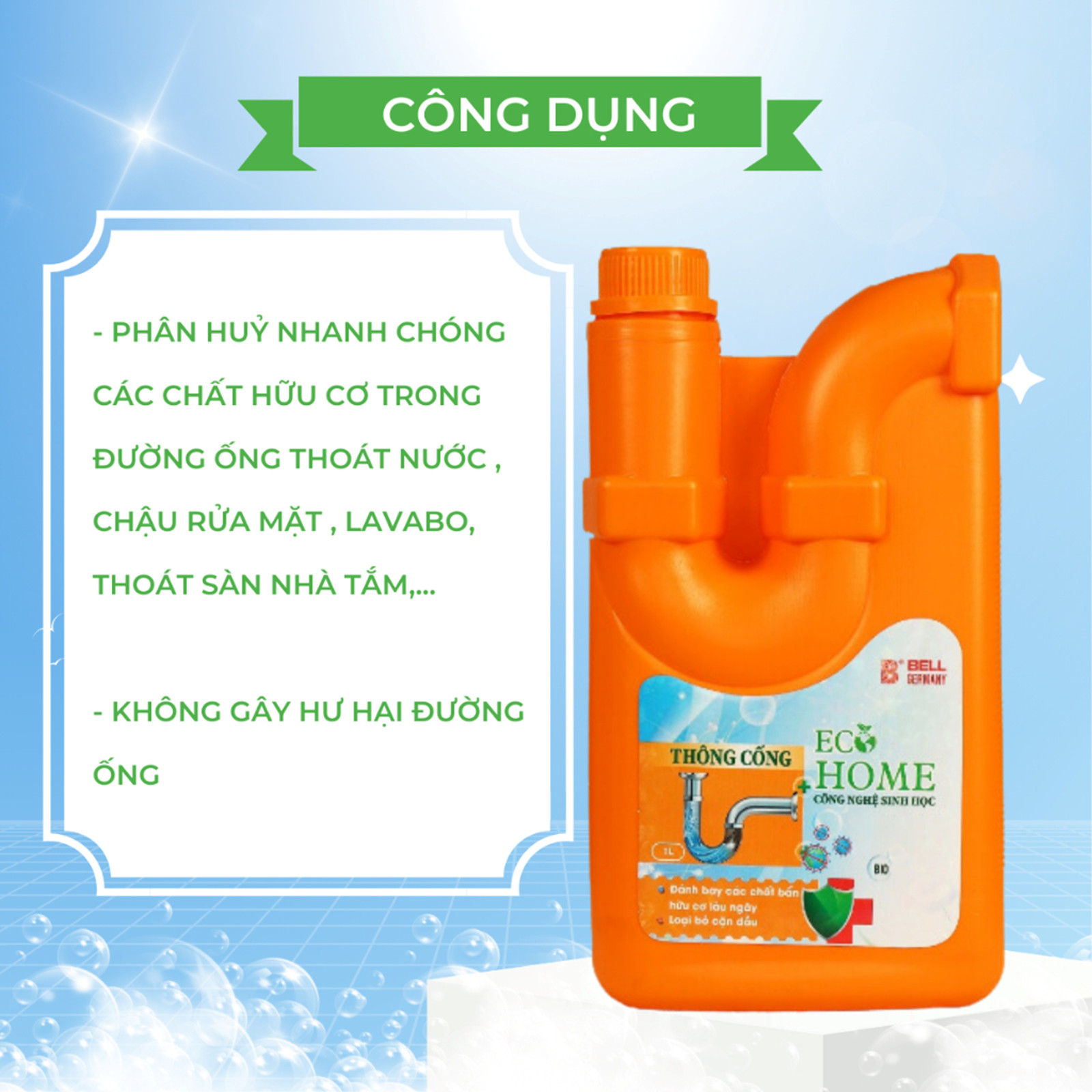 Mua tại TiktokNước Thông Cống Công Nghệ Sinh Học ECOHOME 1 Lít Giúp Phân Hủy Nhanh Chóng Các Chất Hữu Cơ Trong Đường Ống Thoát Nước Thương hiệu: Ecohome Xuất sứ: Tập Đoàn Bell Đức Sản xuất: Việt Nam Thể tích: 1 Lít ĐẶC ĐIỂM NỔI BẬT: Bồn rửa bát bị tắc do dầu mỡ hoặc các chất hữu cơ trong quá trình rửa bát lắng ,bồn cầu bị tắc giấy vệ sinh do sơ sẩy khi đi vệ sinh chúng ta đánh rơi giấy,bồn rửa mặt hoặc nhà tắm cũng rất hay thường xuyên bị tắc do tóc trong quá trình tắm chúng ta để rơi xuống và lâu ngày cũng dẫn đến tắc nghẽn đường ống cục bộ .Vì vậy Ecohome đã cho ra mắt sản phẩm nước thông cống vừa hiệu quả lại tiết kiệm được chi phí. THÀNH PHẤN CHÍNH: