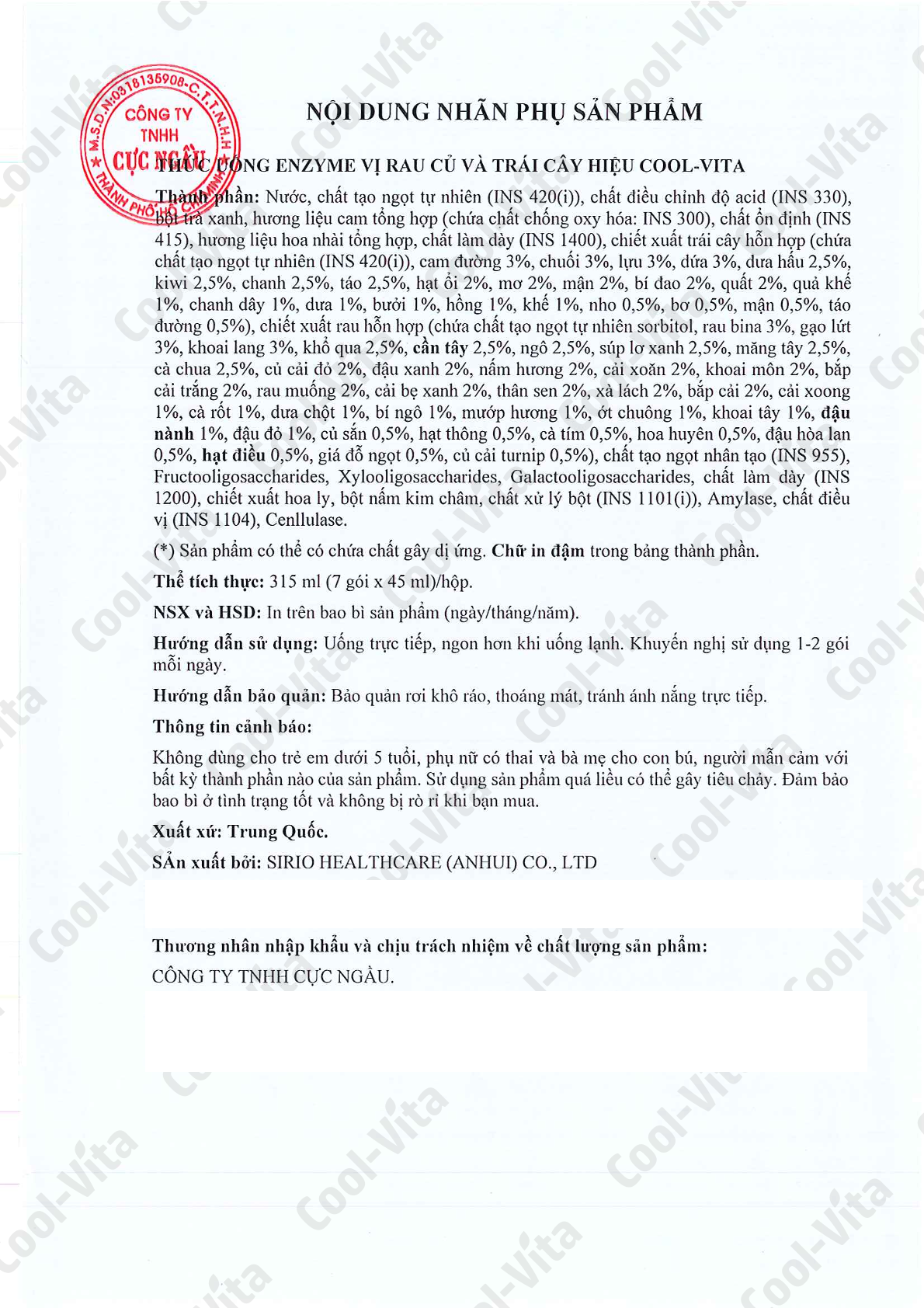 Mua tại TiktokNước Uống Bổ Sung Enzyme Hỗ Trợ Tiêu Hoá, Thanh Lọc Cơ Thể Cool-Vita (45 ml× 7 túi)/hộp Nước uống Enzyme Cool-Vita được chiết xuất từ các loại trái cây rau quả đã được chế biến thành Enzyme và chứa prebiotic fos, gos và xos giúp tăng khả năng miễn dịch và cải thiện sức khỏe tiêu hóa để thức ăn và khoáng chất được hấp thu tốt hơn. Nước Uống Enzyme Cool-Vita Chứa fructooligosacarit (FOS) galactooligosacarit (GOS), xylooligosaccharide (XOS) giúp tăng cường miễn dịch, tăng số lượng vi khuẩn tốt và tăng cường sức khỏe tiêu hóa.