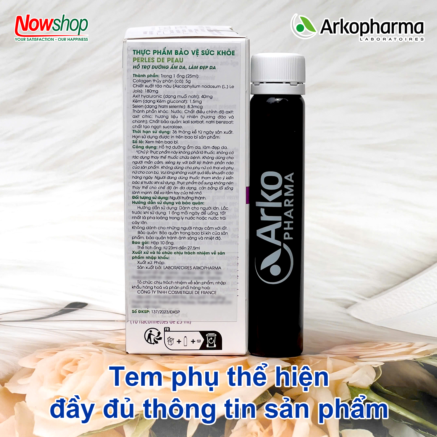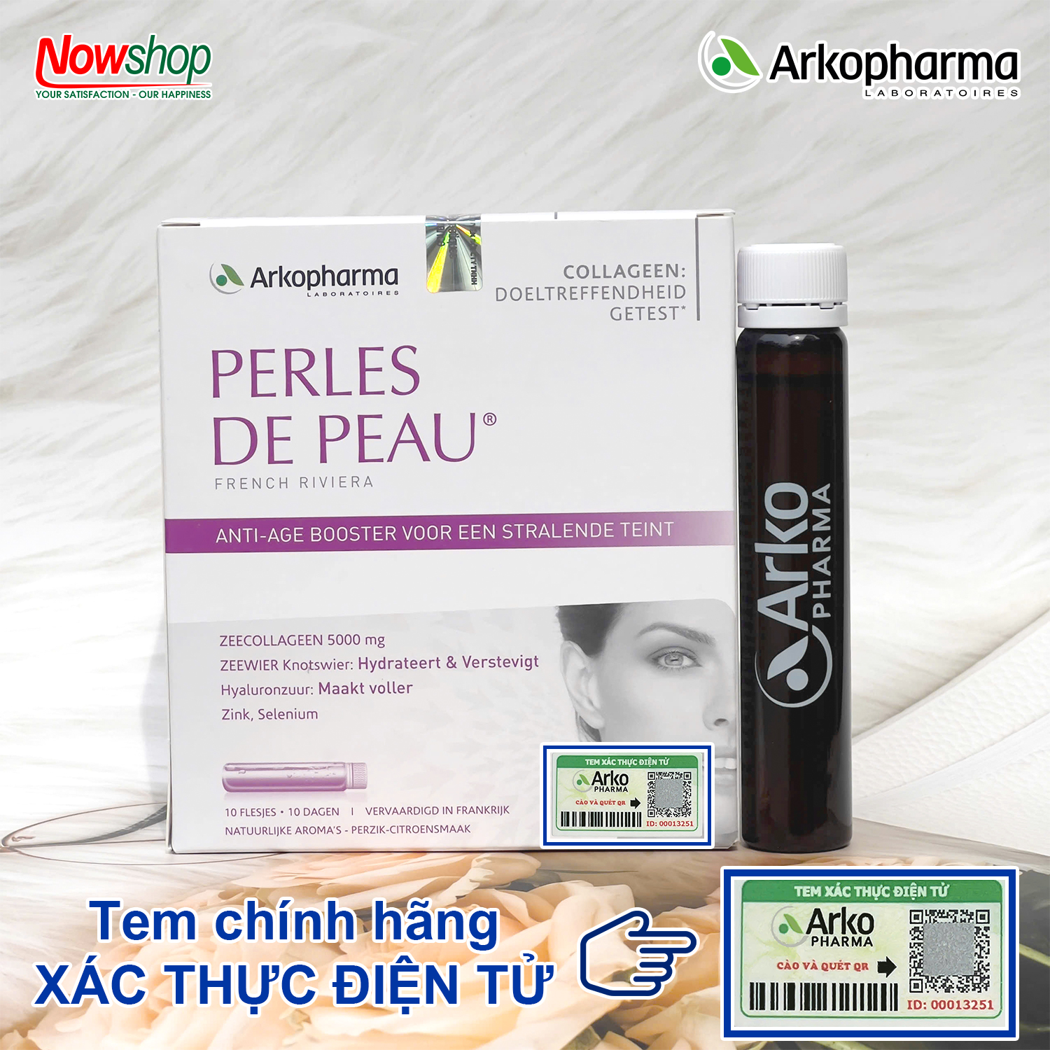 Arkopharma Perles De Peau – bí quyết trẻ hóa da chuẩn Pháp . – Giúp duy trì làn da mịn màng, ẩm mượt, săn chắc và tươi trẻ từ bên trong. Collagen cá thủy phân 5000mg – hấp thu nhanh, giảm nếp nhăn hiệu quả. Công thức 5 trong 1: Collagen + HA + Tảo nâu + Kẽm + Selen – dưỡng ẩm & chống lão hóa toàn diện. Hương đào – chanh thanh mát, dễ uống, không tanh – chăm da mỗi ngày chỉ 1 ống . Hiệu quả rõ rệt sau 2–4 tuần sử dụng đều đặn. Thương hiệu Arkopharma France – hơn 40 năm uy tín – Công thức khoa học, an toàn, hiệu quả nhanh Nhập khẩu chính hãng Pháp – Hóa đơn chứng từ đầy đủ 100%.     Xuất xứ: France (Pháp) Quy cách: Hộp 10 ống x 25ml     THÀNH PHẦN Collagen Marin 5.000mg – Nuôi dưỡng da săn chắc, tăng độ đàn hồi, giảm nếp nhăn và chảy xệ. Chiết xuất tảo nâu 180mg – Chống oxy hóa, bảo vệ da khỏi gốc tự do, duy trì làn da khỏe mạnh. Axit Hyaluronic 40mg – Dưỡng ẩm sâu, giúp da căng mọng, mềm mịn, giảm khô ráp. Kẽm 1,5mg – Hỗ trợ tái tạo tế bào da, giảm viêm, làm da đều màu và khỏe mạnh. Selenium 8,3mcg – Chống oxy hóa, bảo vệ tế bào da, ngăn lão hóa sớm.     CÔNG DỤNG Dưỡng ẩm sâu, giảm khô ráp, bong tróc. Tăng đàn hồi, giúp da căng bóng, săn chắc. ️ Chống oxy hóa, ngăn ngừa lão hóa sớm. Làm sáng da, hỗ trợ giảm sạm nám, tàn nhang. Giúp da mềm mịn, mượt mà và tràn đầy sức sống.     ĐỐI TƯỢNG SỬ DỤNG Người có da khô, thiếu ẩm, dễ xuất hiện nếp nhăn. Người muốn da sáng mịn, đàn hồi, tươi trẻ tự nhiên. Phụ nữ sau 25 tuổi hoặc sau sinh – da yếu, dễ lão hóa. Người thức khuya, stress, tiếp xúc nắng nóng, khói bụi.     HƯỚNG DẪN SỬ DỤNG Uống 1 ống (25ml)/ngày – tốt nhất sau bữa sáng. Lắc nhẹ trước khi uống – có thể uống trực tiếp hoặc pha với nước mát . Duy trì 2–3 tháng liên tục để thấy hiệu quả rõ rệt .     ️ LƯU Ý KHI SỬ DỤNG SẢN PHẨM KHÔNG PHẢI LÀ THUỐC VÀ KHÔNG CÓ CHỨC NĂNG THAY THẾ THUỐC CHỮA BỆNH Hiệu quả của sản phẩm tùy thuộc vào cơ địa và thể trạng của mỗi người Không dùng cho người dị ứng cá, hải sản hoặc nhạy cảm với Iốt. Tránh dùng cho phụ nữ mang thai, cho con bú, trẻ em <18 tuổi.       CÁCH BẢO QUẢN Dùng ngay sau khi mở nắp, tránh để tiếp xúc không khí quá lâu. ️ Bảo quản nơi khô ráo, thoáng mát, tránh ánh nắng trực tiếp, tốt nhất dưới 25ºC. Để xa tầm tay trẻ em.     KHUYẾN CÁO Khi nhận hàng, Quý Khách vui lòng: Kiểm tra sản phẩm ngay khi nhận Quay video nhận và mở đơn hàng khi Shipper giao Điều này giúp thuận tiện cho việc đổi trả nếu có sai sót từ Shop hoặc vận chuyển.     ️ CAM KẾT VÀNG TỪ SHOP Sản phẩm chính hãng - Giống với mô tả - Xuất Hóa đơn giá trị gia tăng 100% Nguồn gốc rõ ràng - Giấy tờ đầy đủ theo quy định của Bộ Y Tế Đảm bảo chất lượng - Dịch vụ tốt nhất (Nhiều Voucher giảm giá kèm nhiều quà tặng hấp dẫn) Hỗ trợ tư vấn 24/7 - Đổi trả miễn phí (Khi có lỗi khách quan) Đóng gói cẩn thận - Giao hàng nhanh chóng (Nhận hàng từ 1-5 ngày kể từ khi đặt hàng tại shop)