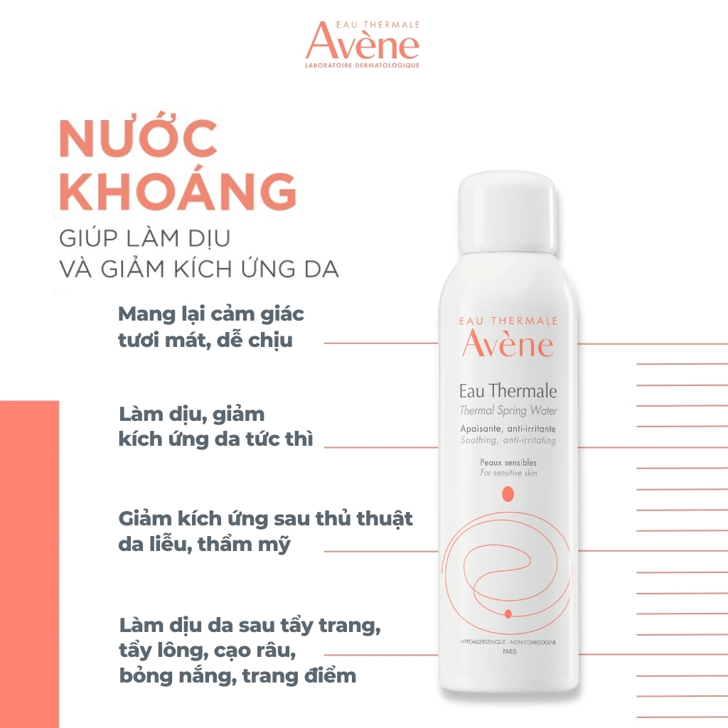 Mua tại TiktokGIỚI THIỆU Nước khoáng Avène làm dịu, giảm kích ứng Avène Thermal Spring Water được đóng chai trực tiếp tại nguồn, trong điều kiện vô trùng, bảo toàn mọi đặc tính làm dịu da. Sản phẩm dạng phun sương cung cấp nước làm dịu da, chăm sóc và dưỡng ẩm cho da, giúp da của bạn luôn mềm mịn tự nhiên. Nước khoáng Avène có hơn 150 nghiên cứu lâm sàng và báo cáo khoa học về an toàn và hiệu quả trong chăm sóc da. THÔNG TIN SẢN PHẨM THÀNH PHẦN: