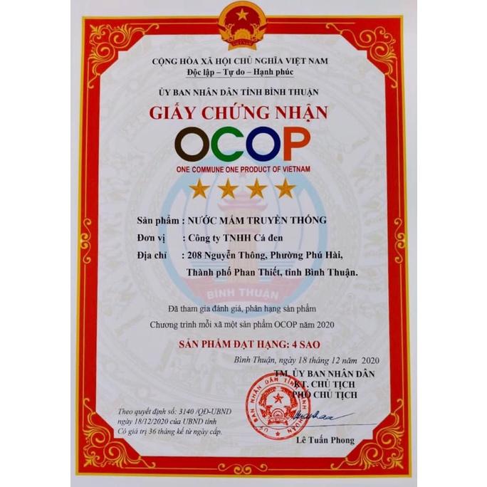 Nước Mắm Cá Đen Phan Thiết đạt chứng nhận tiêu chuẩn HACCP ( tiêu chuẩn VSATTP Châu Âu), OCOP 4 SAO (hạng mục tỉnh Bình Thuận), có giấy phép kiểm định của viện Pasteur HCM