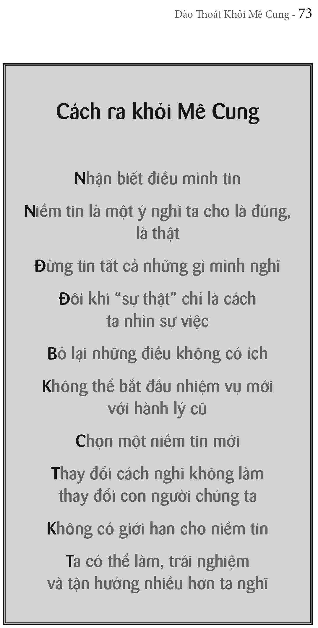 “Đào thoát khỏi Mê Cung” chứa đựng những “thần chú” giúp hoá giải những niềm tin cũ - trở ngại lớn nhất trong mọi sự chuyển hoá.