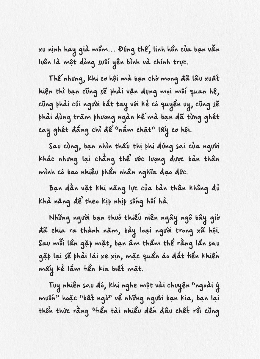 Hy vọng cuốn sách nhỏ này sẽ trở thành người đồng hành cùng bạn trong hành trình trưởng thành đầy rẫy những gian nan - nhưng cũng biết bao điều kỳ thú. Mỗi khi thấy nản chí hay mỏi mệt, hãy mở một trang sách bất kỳ, nhâm nhi từng dòng để cảm thấy trái tim của bạn được ôm ấp, vỗ về.