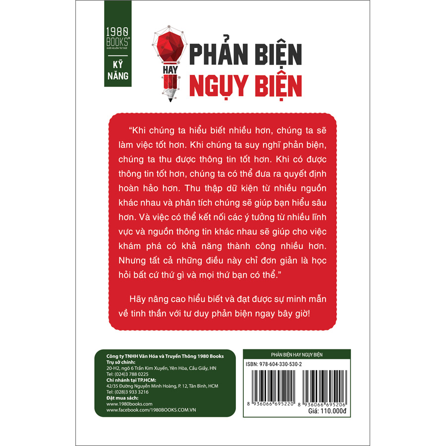 - Thậm chí, chúng ta đang bị thao túng bởi các mánh khóe quảng cáo? Tất cả chúng ta đều đã ở trong những tình huống này. Và cuốn sách này sẽ giúp bạn cải thiện tình trạng đó! “Phản biện hay ngụy biện” là một cuốn sách về tư duy phản biện. Cuốn sách không nhằm “thay đổi suy nghĩ của bạn thay đổi cuộc đời bạn”, mà là một cuốn sổ tay hướng dẫn từng bước trình bày các nguyên tắc cốt lõi của tư duy phản biện, mang đến cho người đọc những hướng dẫn thực tế về cách lập trình lại bản thân để có những hiểu biết sâu sắc hơn và sống có ý thức hơn. Tại đây, bạn sẽ tìm thấy các công cụ hành động đã được nghiên cứu chứng minh sẽ giúp bạn chuyển đổi tư duy của bạn để giải quyết các vấn đề phức tạp, vượt qua trở ngại, khám phá cơ hội, suy nghĩ rõ ràng và chính xác hơn. Đặt những câu hỏi hay hơn để tìm ra câu trả lời chính xác hơn và rút ra những hiểu biết sâu sắc hơn.