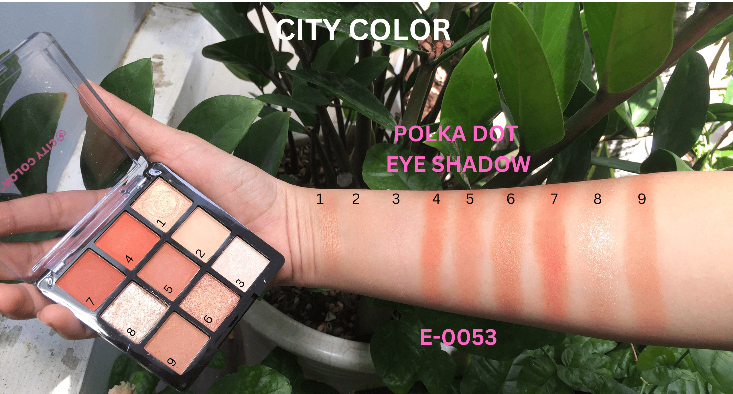 bảng màu Phấn mắt City Color Polka Dot với chín sắc thái được đánh dấu từ 1 đến 9. Bạn muốn mô tả màu sắc cho từng sắc thái trong số chín sắc thái từ trên xuống dưới trong mỗi cột. Đây là một sự cố: Cột 1: Màu 1: Màu sâm panh nhẹ với lớp nền lung linh. Màu 4: Màu cam mờ rực rỡ. Màu 7: Màu đất nung đậm. Cột 2: Màu 2: Màu be nhạt. Màu 5: Màu đào ấm áp Màu 8: Ánh vàng lấp lánh lấp lánh. Cột 3: Màu 3: Ngọc trai lung linh. Màu 6: Màu vàng hồng lấp lánh. Màu 9: Màu nâu lì mềm mại. Mỗi sắc thái đã được swatch trên cánh tay, thể hiện sắc tố và độ hoàn thiện của chúng.
