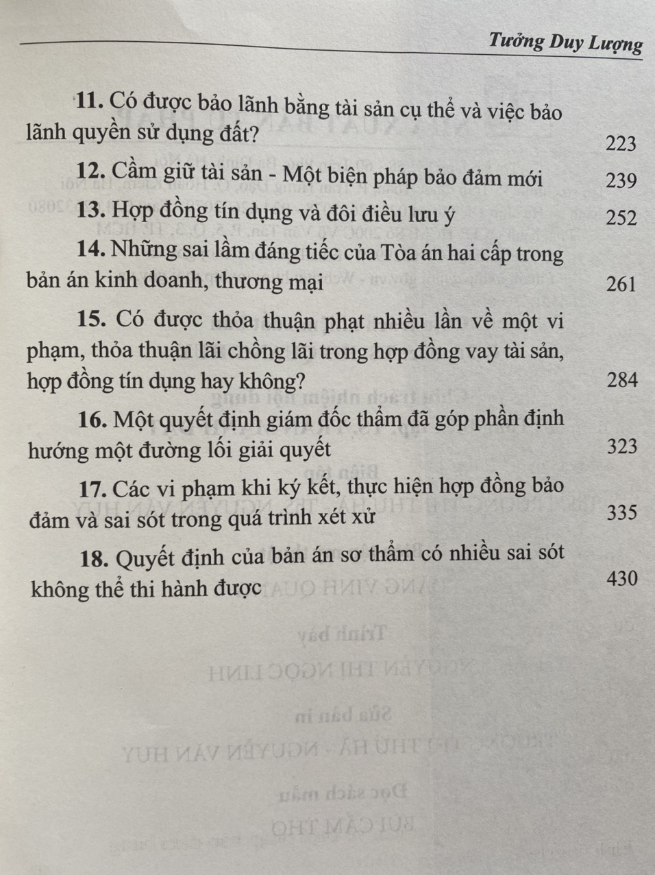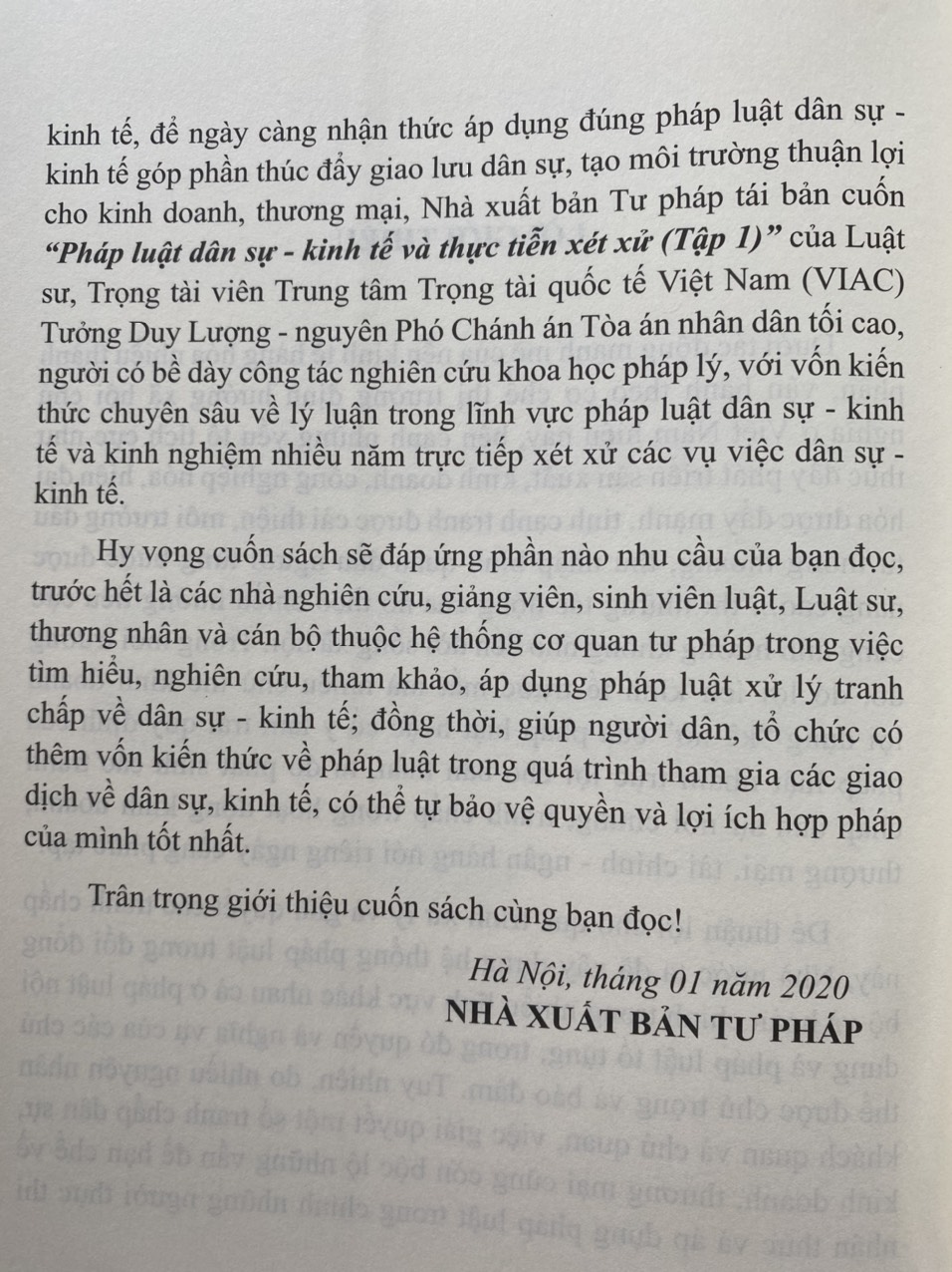 Nhằm góp phần nghiên cứu, tìm hiểu những quy định của pháp luật cũng như bản chất các vụ việc, thực tiễn giải quyết trang chấp và những thiếu sót trong quá trình giải quyết tranh chấp về dân sự-kinh tế, để ngày càng nhận thức áp dụng đúng pháp luật dân sự - kinh tế góp phần thúc đẩy giao lưu dân sự, tạo môi trường thuận lợi cho kinh doanh, thương mại, Nhà xuất bản Tư Pháp xuất bản cuốn sách " Pháp luật dân sự - kinh tế và thực tiễn xét xử ( Tập 1)" của Luật sư Tưởng Duy Lượng  - nguyên Phó Chánh án Tòa án nhân dân tối cao, người có bề dày công tác nghiên cứu khoa học pháp lý, với vốn kiến thức chuyên sâu về lý luận trong lĩnh vực pháp luật dân sự- kinh tế và kinh nghiệm nhiều năm trực tiếp xét xử các vụ việc dân sự - kinh tế Xin trân trọng giới thiệu cuốn sách đến bạn đọc!