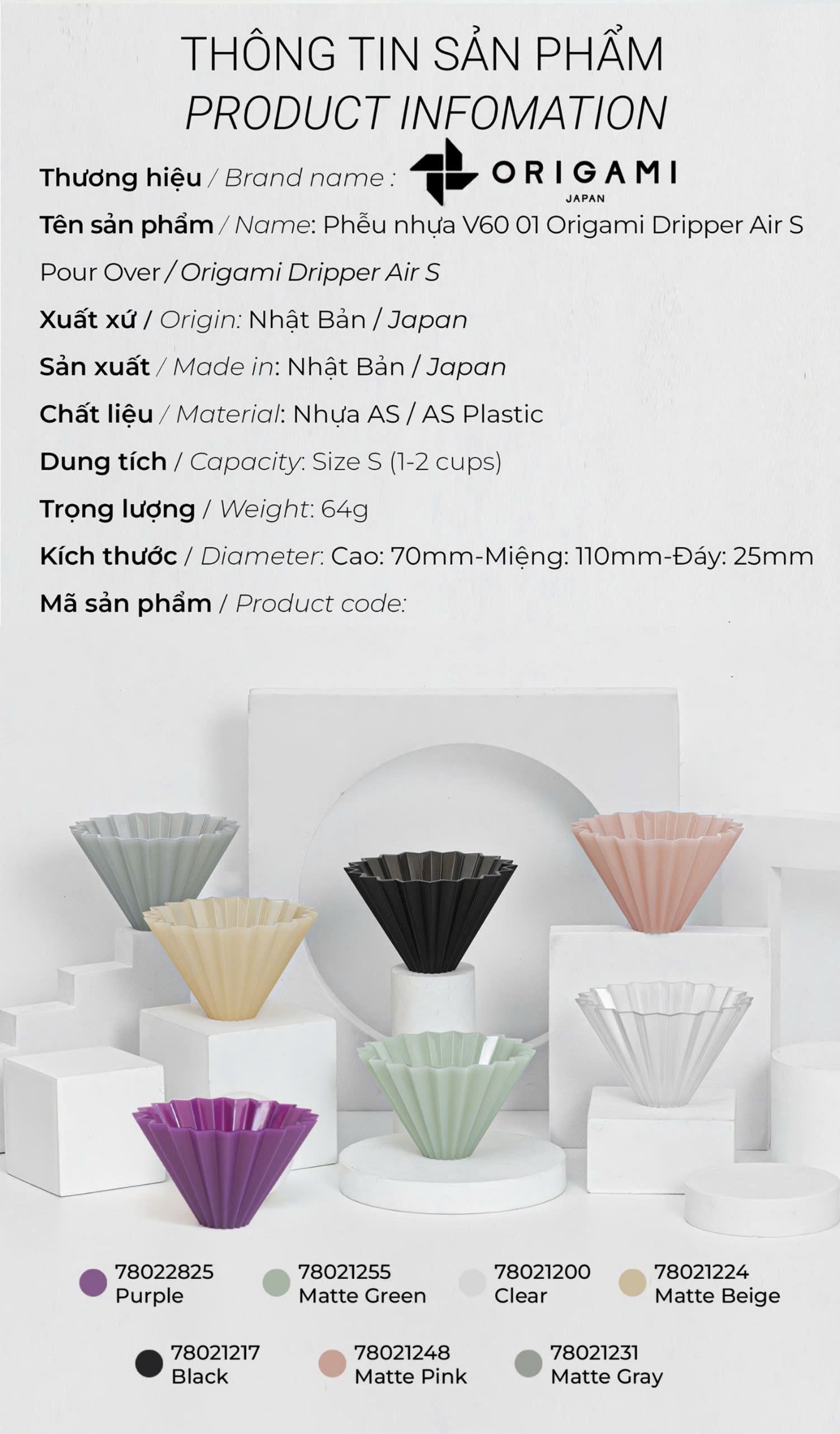 Origami Dripper Air S Pour over: Thừa hưởng toàn bộ kết cấu của một chiếc phễu Origami với 20 nếp gấp tạo rãnh: Kiểm soát lưu thông dòng chảy và không khí Siêu nhẹ: 64g Siêu bền: Chất liệu nhựa AS Resin bền bỉ và thân thiện với môi trường. Bạn có thể đem đi bất kỳ đâu, sẵn sàng pha cà phê ở nhà, công ty, khách sạn, camping…mà không sợ phễu bị vỡ hỏng trong quá trình vận chuyển. Siêu thoáng: Với các rãnh gấp rõ ràng và nổi hơn hẳn bản phễu sứ, độ thông thoáng giữa giấy và phễu lọc tốt hơn khiến dòng chảy ổn định hơn. ĐIỂM KHÁC BIỆT GIỮA PHỄU NHỰA ORIGAMI AIR VÀ PHỄU SỨ LÀ GÌ? Phễu nhựa Origami Air rẻ hơn phễu sứ gần 50%: Một chiếc phễu backup quá tuyệt vời cho nhu cầu cơ động với cái giá hết sức dễ chịu của một sản phẩm sản xuất tại Nhật Bản. Phễu nhựa Origami Air có rãnh thoát sâu hơn phễu sứ: Origami Air S Dripper cũng có các cạnh gấp rõ nét hơn về phía gốc của phễu, giúp nâng giấy lọc của bạn lên thoáng hơn để nước có thể lưu thông dễ dàng mà không bị nghẽn (đặc biệt là giấy lọc kiểu sóng Kalita). Phễu nhựa Origami Air bền hơn phễu sứ: Chất liệu nhựa AS Resin rất cứng và chịu va đập tốt nên bạn có thể an tâm dùng trong mọi hoàn cảnh. Phễu nhựa Origami Air nhẹ hơn phễu sứ: Chỉ 64g, phễu Origami Air là chiếc phễu nhẹ nhất trong các phễu lọc hiện nay, giúp gọn nhẹ hàng trang của bạn trong những chuyến hành trình. Điều thú vị nhất của phễu Origami Dripper Air S là nó có thể sử dụng cả giấy lọc V60 size 01 và giấy Kalita Wave 155 dạng sóng để đạt được những hương vị khác nhau: Giấy lọc V60 hình nón tăng cường tính axit, đem lại vị chua sáng trong tách cà phê của bạn. Giấy Kalita Wave để tăng cường vị ngọt và cảm giác đầy đặn của cà phê Đội ngũ kiến trúc sư thiết kế đã làm việc với nhiều barista để đưa ra hình dáng hoàn hảo nhằm đạt được thời gian nở và nhỏ giọt lý tưởng. 20 nếp gấp đảm bảo thông thoáng giữa ống nhỏ giọt và bộ lọc giấy. Điều này đảm bảo nước nóng đi qua trơn tru, tạo ra các kênh không khí phù hợp và hỗ trợ khai thác ở các nhiệt độ khác nhau. THÔNG TIN KỸ THUẬT PHỄU NHỰA ORIGAMI Thương hiệu: ORIGAMI Màu sắc: Clear, Black, Matt Beige, Matt Gray, Matt Pink, Matt Green Chất liệu: Nhựa AS Resin Size S: Phù hợp pha từ 12-20g cà phê/ lần Kích thước: Đường kính miệng: 110mm x Cao: 70mm – Lỗ thoát Φ25mm Khối lượng: 64g Made in Japan