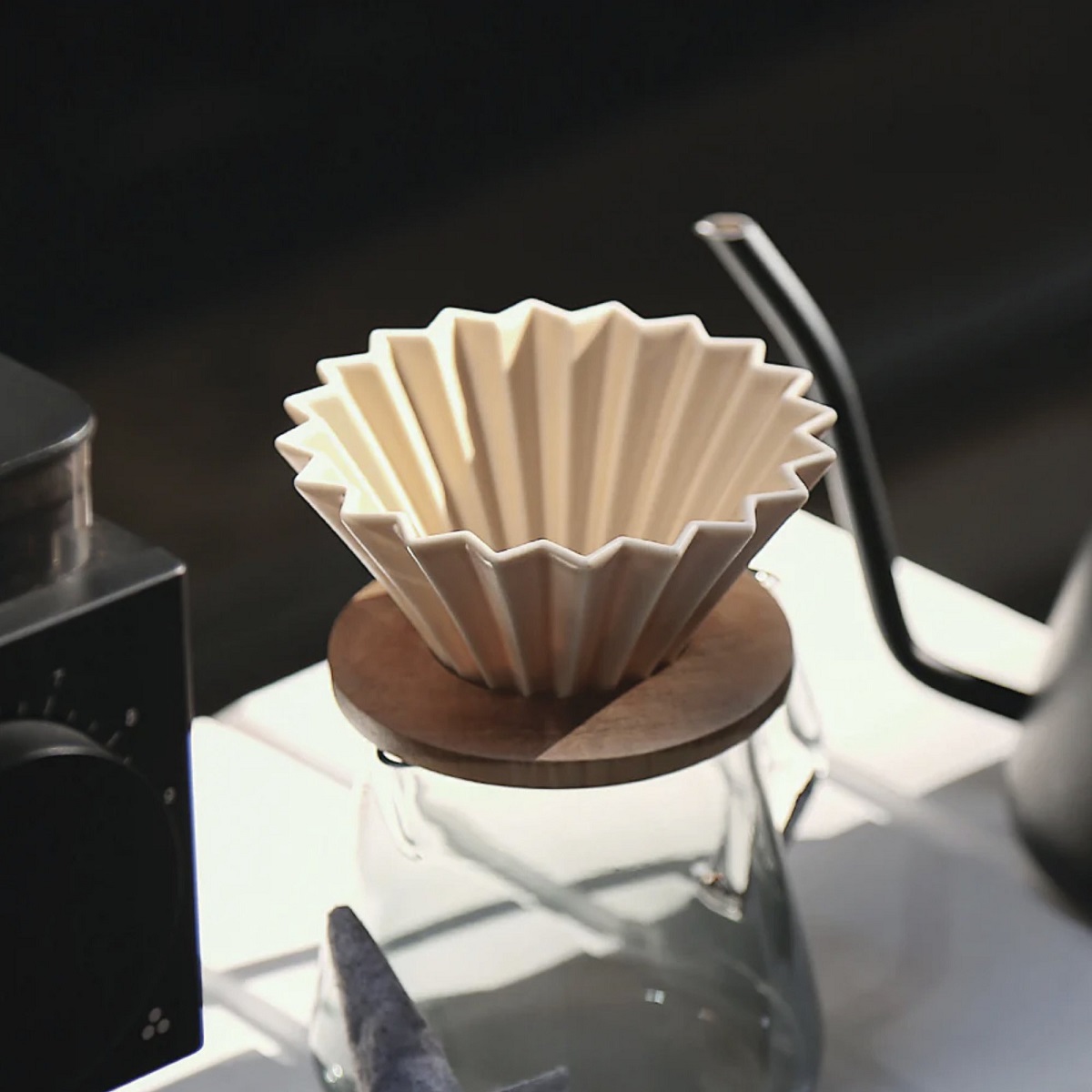 Nghệ thuật gấp giấy Origami Nhật Bản ngày nay có sức hút rất lớn và vẫn không ngừng lan tỏa ra khắp thế giới. Để làm ra một tác phẩm Origami cần rất nhiều sự tỉ mỉ và chau chuốt đến từng đường gấp. Được lấy cảm hứng từ môn nghệ thuật Origami kết hợp cùng với nền gốm sứ lâu đời của Nhật đã tạo ra sự ra đời của phễu lọc cà phê Origami. Từ việc luyện đất, nặn, nung, tráng men, đều hoàn toàn được làm thủ công. Toàn bộ quá trình phải dựa hoàn toàn vào sự khéo léo và kinh nghiệm của người nghệ nhân để duy trì chất lượng cao của sản phẩm.