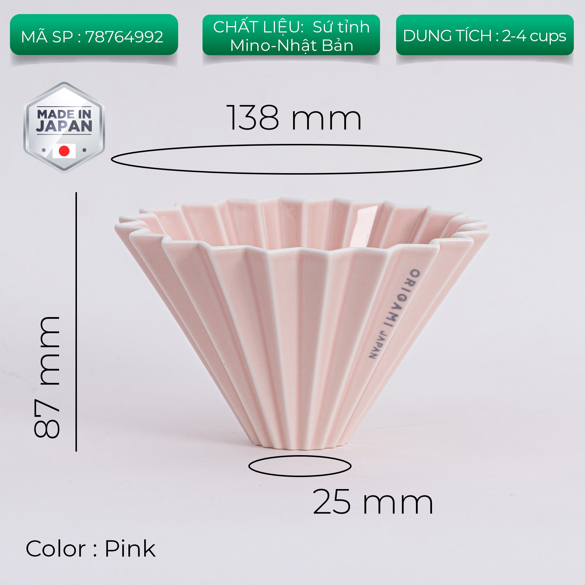Mô tả chung: + Chất liệu gốm sứ Mino chất lượng cao của Nhật Bản+ Đường rãnh gấp giúp ổn định tốc độ dòng chảy+ Size M (2 - 4 cup)+ Tương thích với giấy lọc V60 và giấy lọc Kalita/...