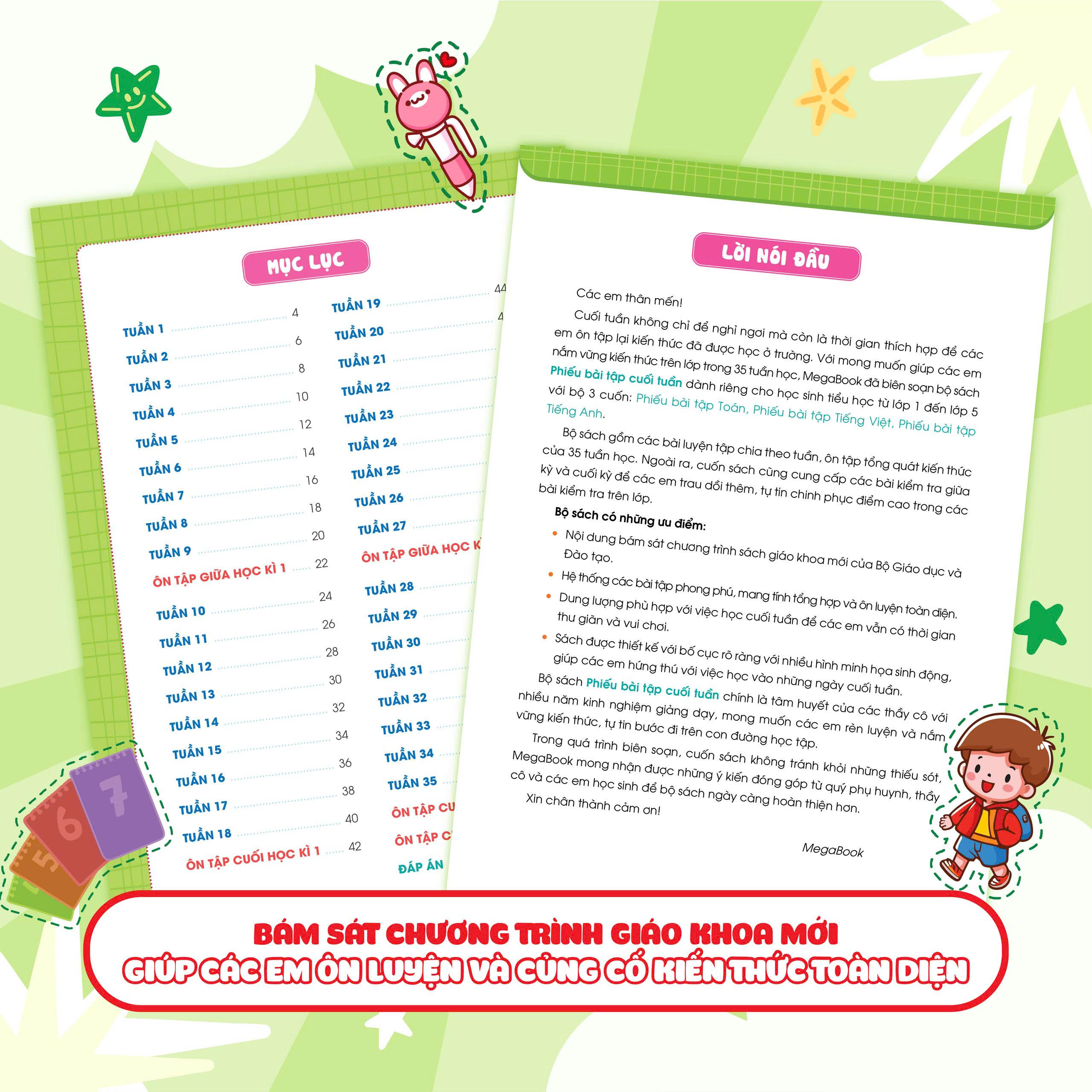 Cuối tuần không chỉ để nghỉ ngơi mà còn là thời gian thích hợp để các con ôn tập lại kiến thức đã được học ở trường. Với mong muốn giúp các con nắm vững kiến thức trên lớp trong 35 tuần học, MegaBook đã biên soạn bộ sách Phiếu bài tập cuối tuần Toán lớp 5 dành riêng cho học sinh lớp 5 ƯU ĐIỂM CỦA CUỐN SÁCH PHIẾU BÀI TẬP CUỐI TUẦN TOÁN LỚP 5: