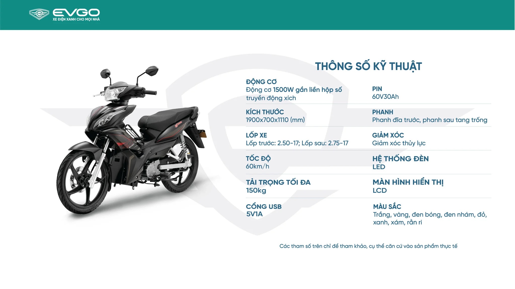 GIÁ XE NIÊM YẾT: 28,500,000 VNĐ - GIÁ XE CHƯA BAO GỒM PIN Đặt cọc xe trị giá 5Trđ + Miễn phí giao hàng + Tặng kèm Mũ bảo hiểm & áo phông EVGO. Nhận xe trong tháng 8/2023. Liên hệ: XE MÁY ĐIỆN EVGO để biết thêm thông tin chi tiết.