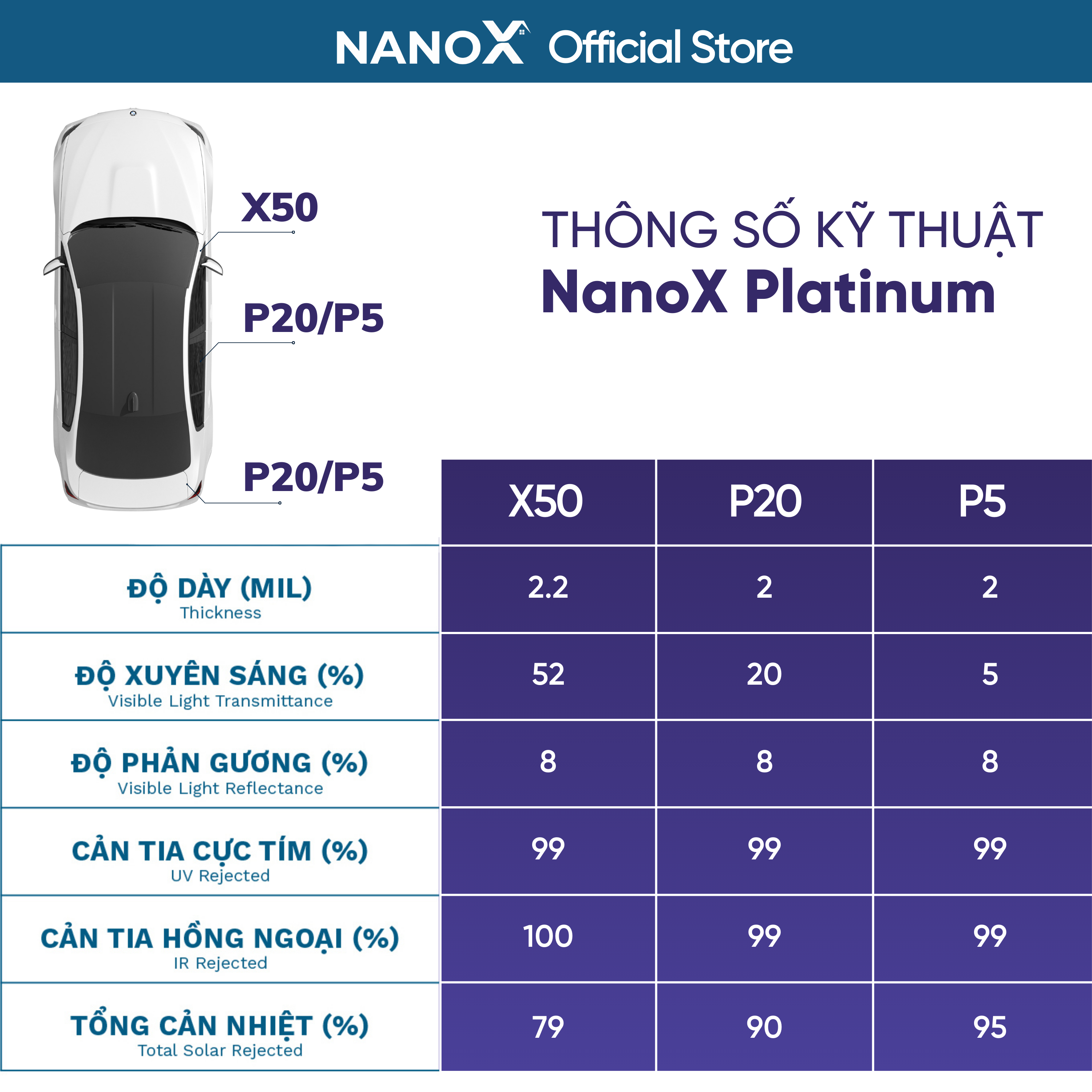 - NanoX Paltinum: Công nghệ Nano Ceramic cao cấp, Kính lái X50 cản nhiệt cao, trong suốt tối đa