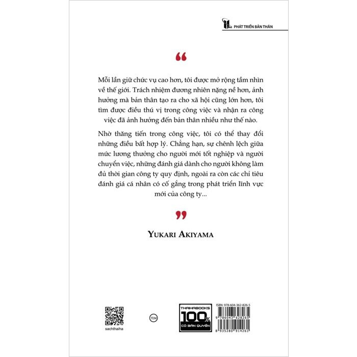 Nắm giữ chức vụ lãnh đạo lâu năm của các doanh nghiệp, Yukari Akiyama thấy mình thực sự trưởng thành hơn trong từng vai trò khi được thăng tiến. Mỗi lần giữ chức vụ cao hơn, được mở rộng tầm nhìn về thế giới. Trách nhiệm đương nhiên nặng nề hơn, ảnh hưởng mà bản thân tạo ra cho xã hội cũng lớn hơn, bà tìm được điều thú vị trong công việc và nhận ra công việc đã ảnh hưởng đến bản thân nhiều như thế nào.