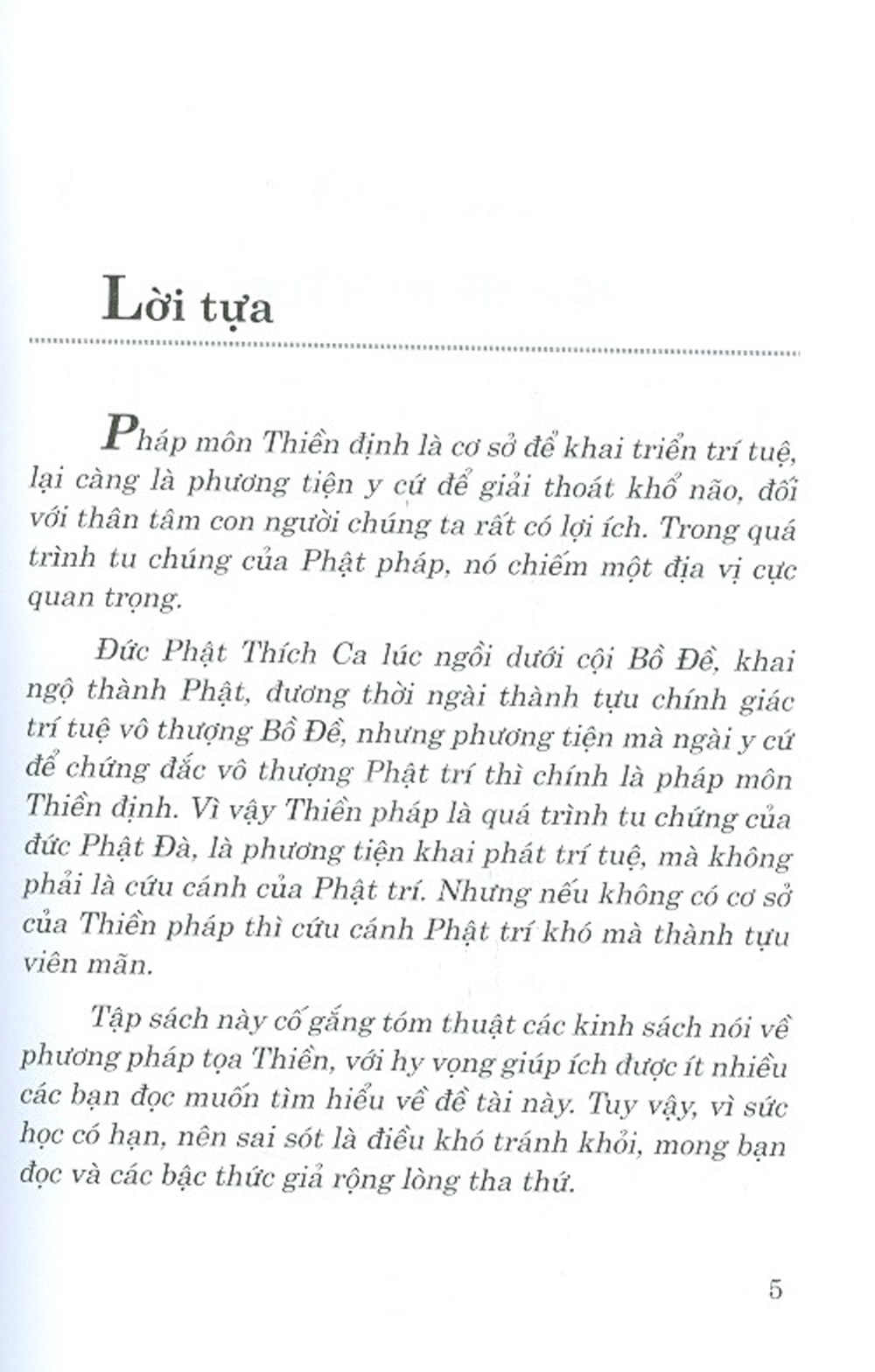 Tập sách này cố gắng tóm thuật các kinh sách nói về phương pháp tọa Thiền, với hy vọng giúp ích được ít nhiều các bạn đọc muốn tìm hiểu về đề tài này.