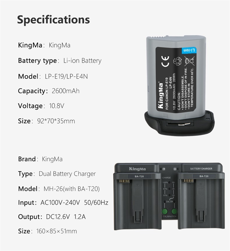 Thông tin kỹ thuật sạc MH-26 cho pin Kingma LP-E19, LP-E4N: