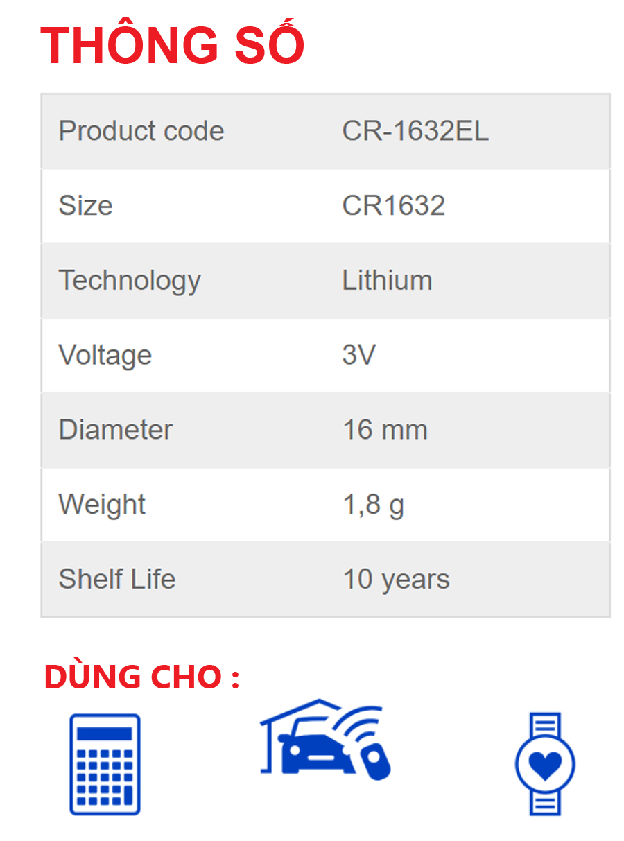 Pin CR1632 của lithium lithium có điện áp cao 3V. Tóm lại: rất nhiều năng lượng trong một thiết kế siêu nhỏ gọn. Bạn có đủ với một pin lithium so với 2, 3 hoặc nhiều pin truyền thống. Chọn pin lithium coin CR1632 làm nguồn năng lượng mạnh mẽ cho các thiết bị nhỏ của bạn.