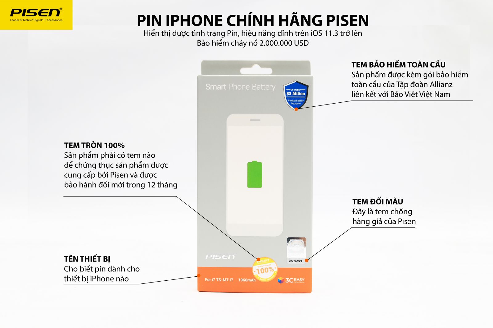 Nhà sản xuất: PISEN GROUP Pin Pisen dung lượng chuẩn tương tự pin gốc Apple về cả phần cứng lẫn phần mềm Điểm đặc biệt của dòng pin Li-ion Polymer có thể duy trì được