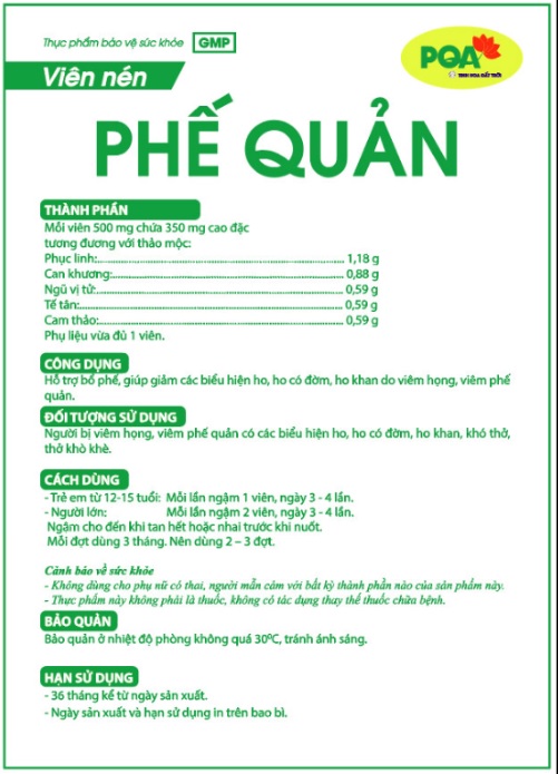 PQA Viên nén Phế Quản là dược phẩm thảo dược hỗ trợ bổ phế giúp giảm các biểu hiện ho, ho có đờm, ho khan do viêm họng, viêm phế quản.
