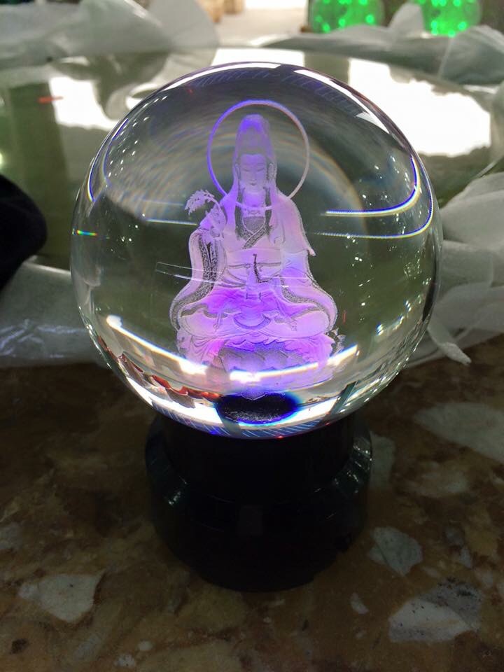Quả Cầu Pha Lê 3D khắc Quan Thế Âm Bồ Tát ngồi trên đế đèn nhiều màu xoay tự động