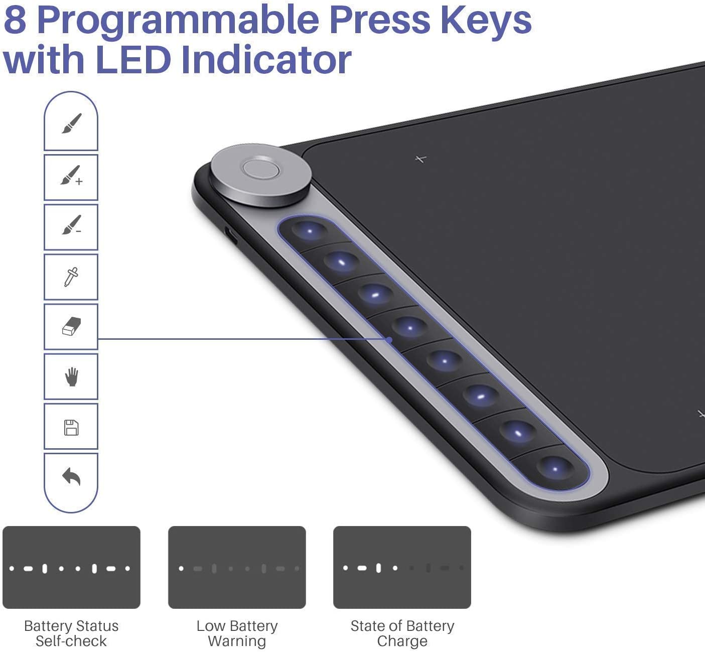 - Multi-purpose,LED indicators There is a LED light embedded in the eight press keys respectively, which can indicate the remaining battery power, low battery and the consumption of the power in real time. When you power the pen tablet on, 8 LED lights will turn on one after another, while lights will go off subsequently if you turn the pen tablet off.