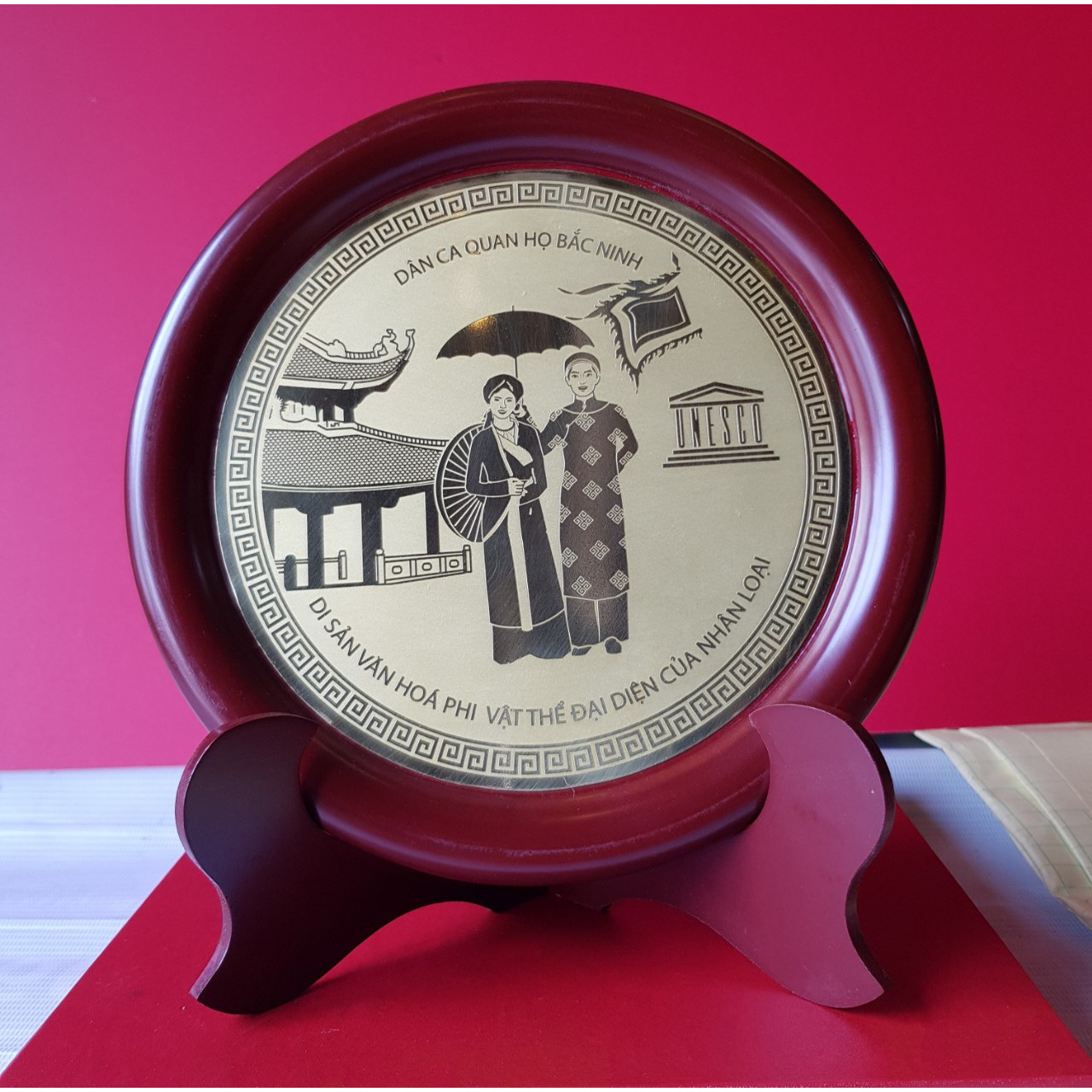 Sản phẩm tranh đĩa anh hai chị hai quan họ , tranh có chân để bàn phù hợp cho món quà tặng lưu niệm bền đẹp đầy ý nghĩa. Chất liệu được làm từ đồng vàng nguyên chất, viền khung và chân bằng gỗ,bao bì hộp giấy lụa màu đỏ đun sang trọng.