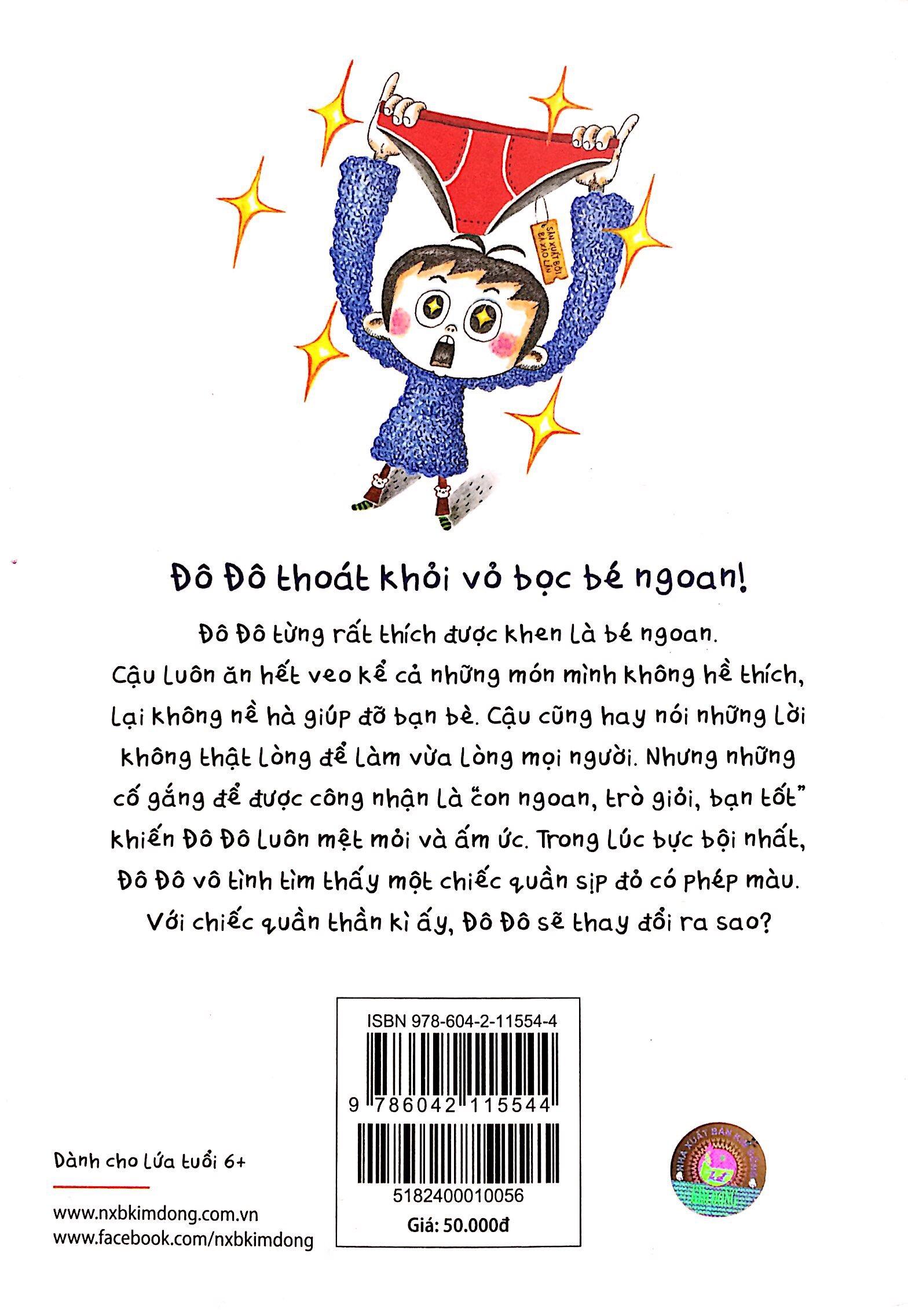 Đô Đô thoát khỏi vỏ bọc bé ngoan! Đô Đô từng rất thích được khen là bé ngoan. Cậu luôn ăn hết veo kể cả những món mình không hề thích, lại không nề hà giúp đỡ bạn bè. Cậu cũng hay nói những lời không thật lòng để làm vừa lòng mọi người. Nhưng những cố gắng để được công nhận là “con ngoan, trò giỏi, bạn tốt” khiến Đô Đô luôn mệt mỏi và ấm ức. Trong lúc bực bội nhất, Đô Đô vô tình tìm thấy một chiếc quần sịp đỏ có phép màu. Với chiếc quần thần kì ấy, Đô Đô sẽ thay đổi ra sao? Sách dành cho lứa tuổi 6+