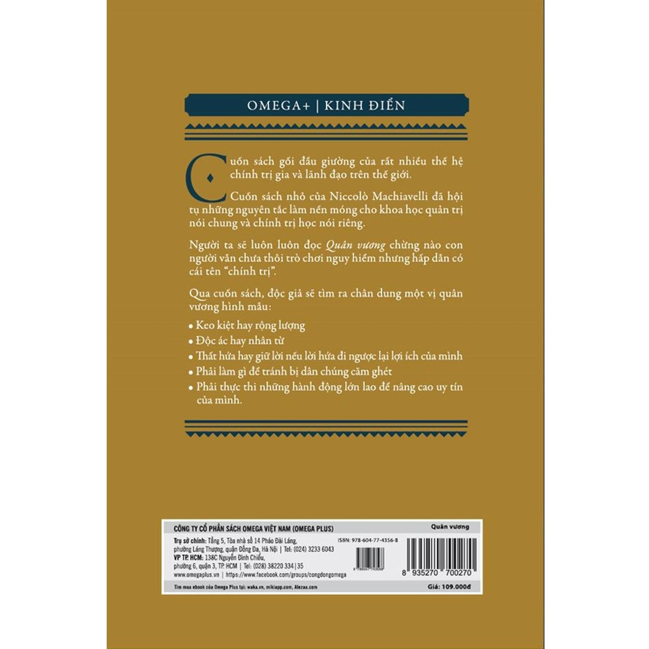 CUỐN SÁCH GỐI ĐẦU GIƯỜNG CỦA RẤT NHIỀU THẾ HỆ CHÍNH TRỊ GIA VÀ LÃNH ĐẠO TRÊN THẾ GIỚI. Chỉ trong một cuốn sách nhỏ của Machiavelli đã hội tụ những nguyên tắc làm nền móng cho khoa học quản trị nói chung và chính trị học nói riêng. Người ta sẽ luôn luôn đọc Quân vương chừng nào con người vẫn chưa thôi trò chơi nguy hiểm nhưng hấp dẫn có cái tên “chính trị”.Qua cuốn sách, độc giả sẽ tìm ra chân dung một vị quân vương hình mẫu: • Keo kiệt hay rộng lượng • Độc ác hay nhân từ • Thất hứa hay giữ lời nếu lời hứa đi ngược lại lợi ích của mình • Phải làm gì để tránh bị dân chúng căm ghét • Phải thực thi những hành động lớn lao để nâng cao uy tín của mình .