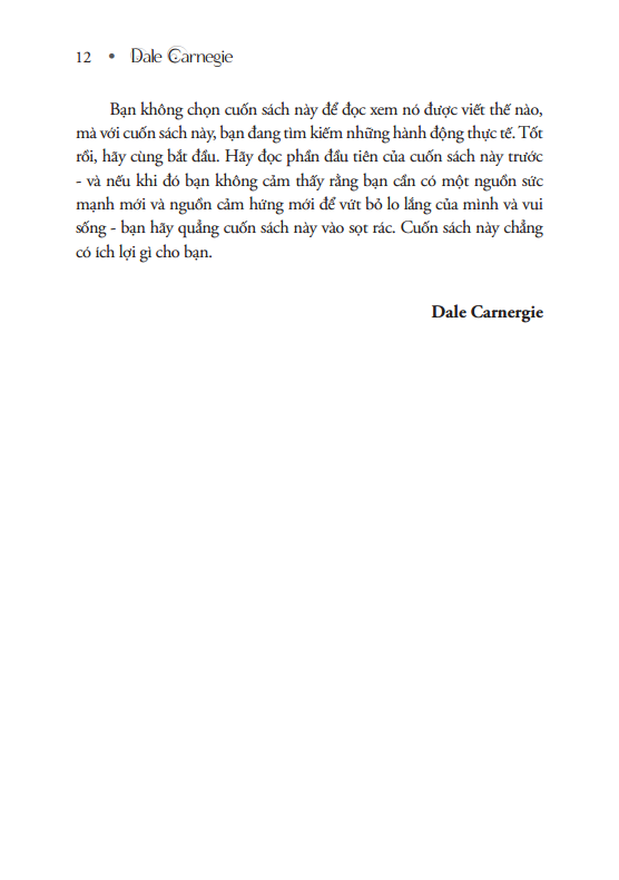 - Hãy quên đi bản thân bằng cách quan tâm đến người khác. Mỗi ngày làm một điều tốt có thể khiến ai đó mỉm cười Qua hơn nửa thế kỷ, những lời khuyên thiết thực và sâu sắc của Dale Carnegie vẫn còn nguyên giá trị cho đến ngày nay. Ngay bây giờ, bạn đã có thể ghi tên mình vào danh sách hàng triệu con người đã học được cách: Quẳng gánh lo đi và vui sống!